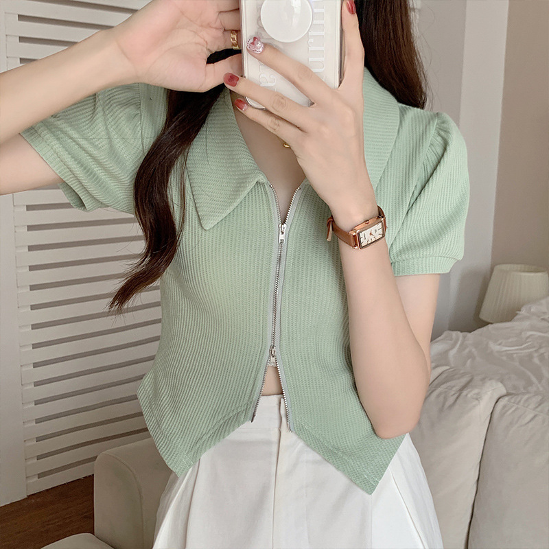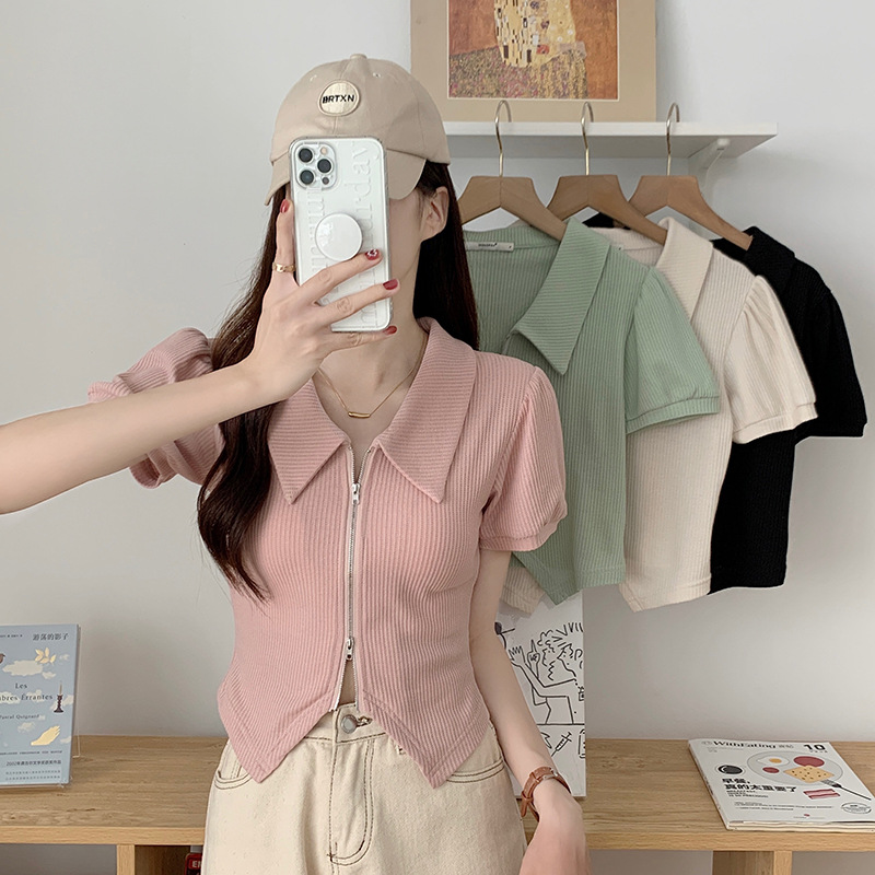 短款t恤女翻领Polo衫学生拉链开衫修身高腰露脐短袖上衣设计感夏