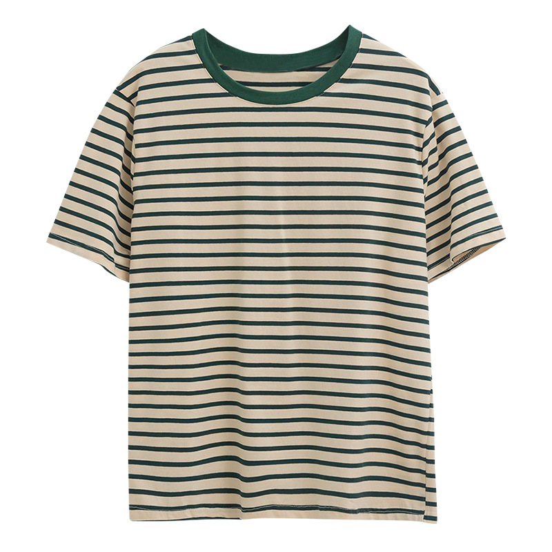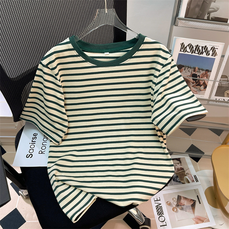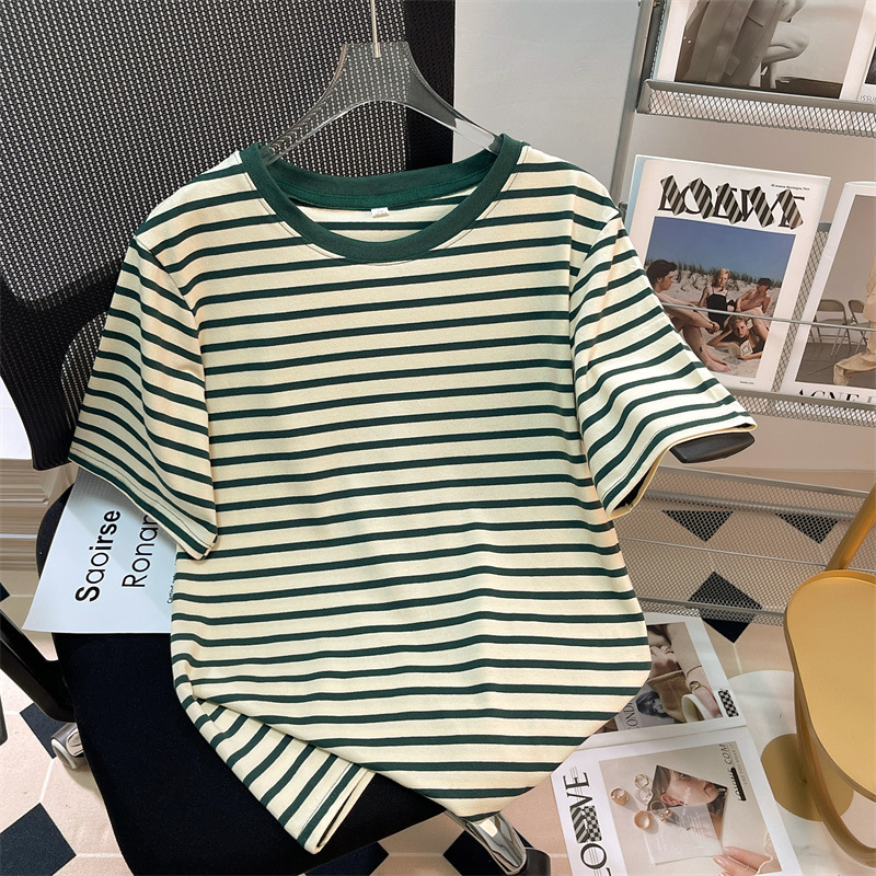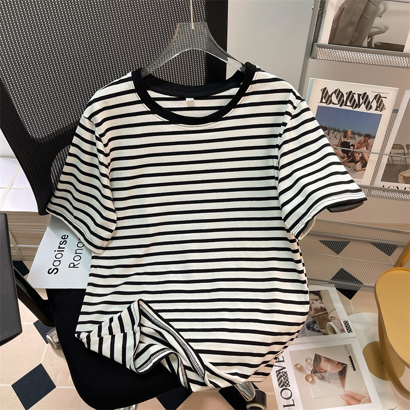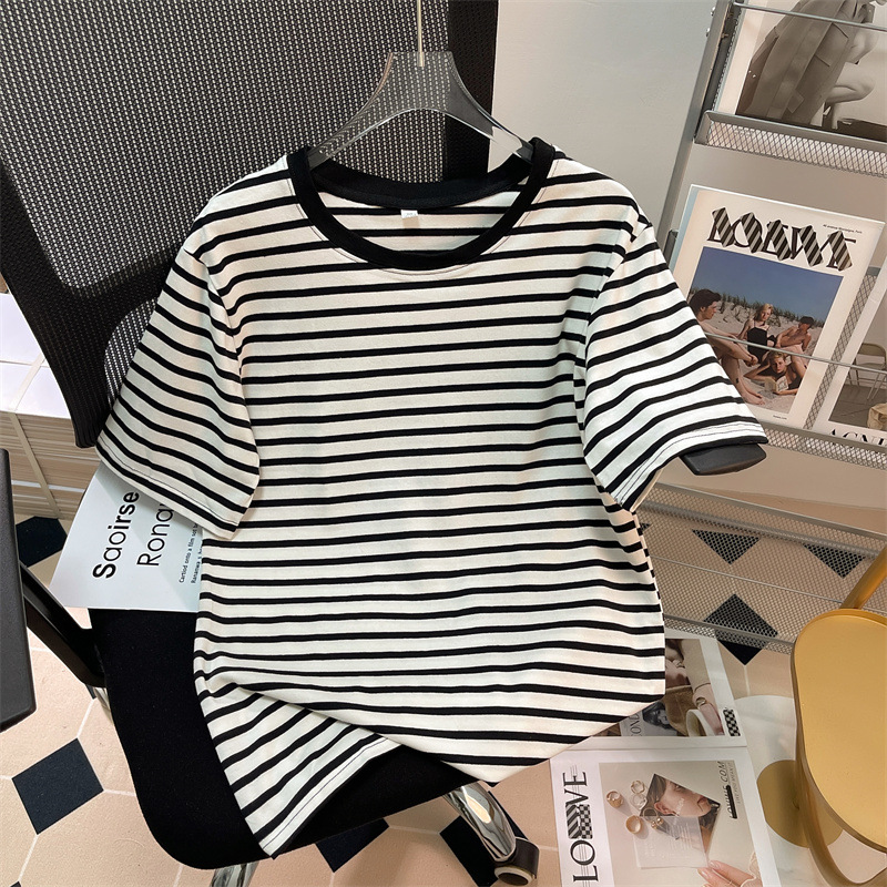 纯棉撞色条纹短袖T恤女夏季宽松显瘦大码学生百搭半袖打底上衣服