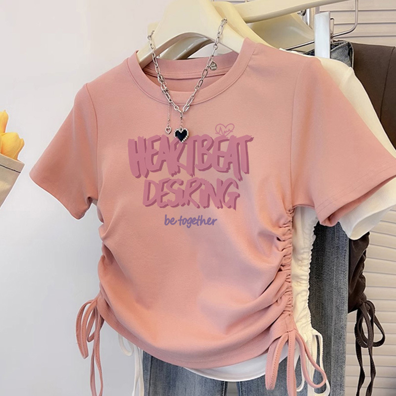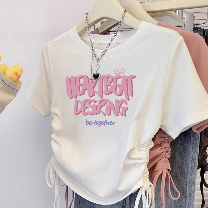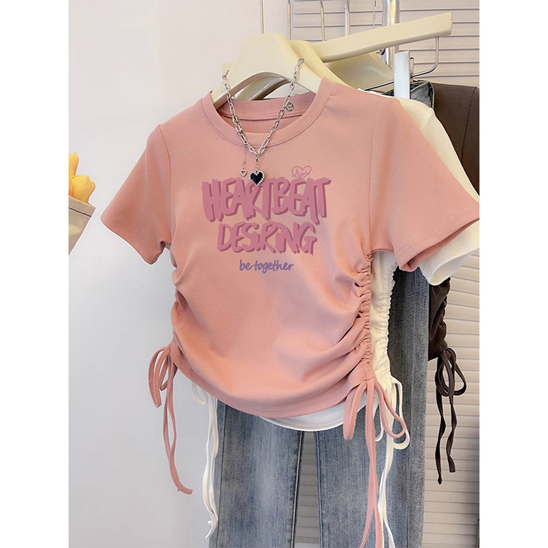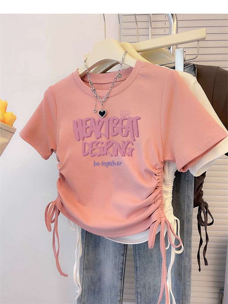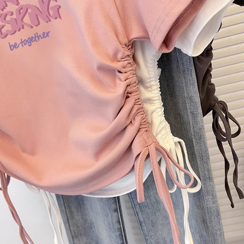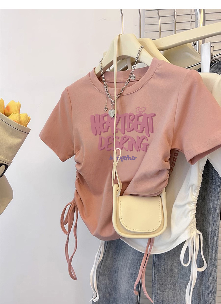 纯棉T恤女短袖修身短款甜辣夏季新款抽绳收腰美式圆领上衣