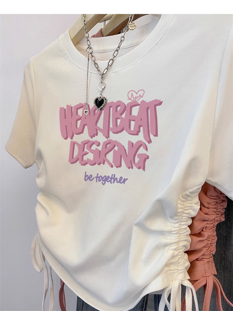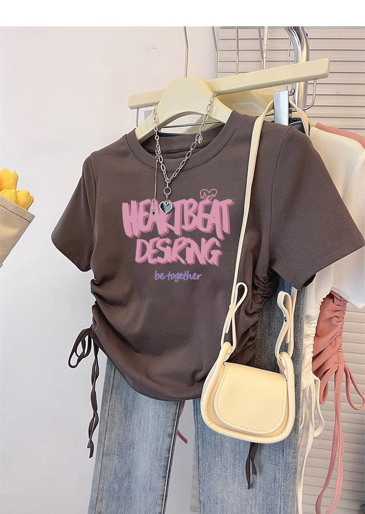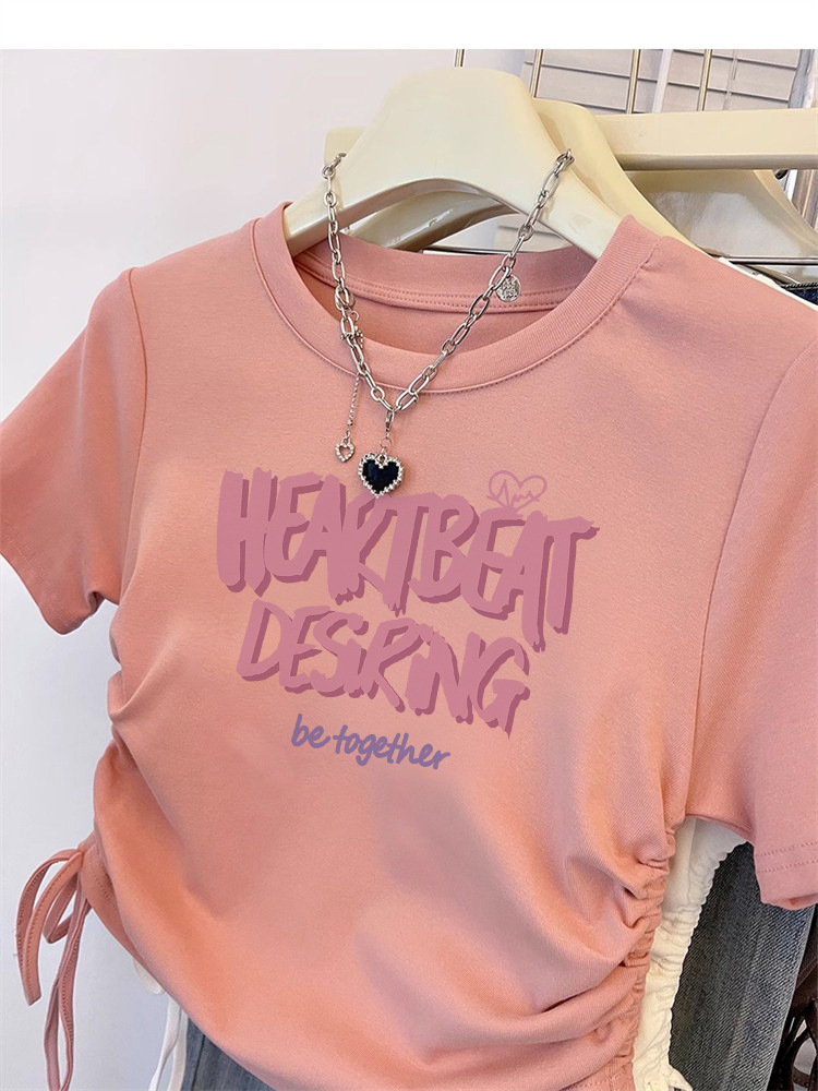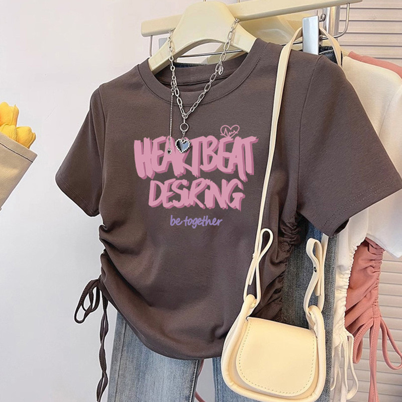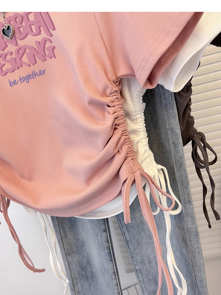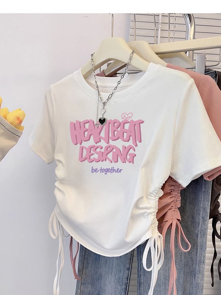 纯棉T恤女短袖修身短款甜辣夏季新款抽绳收腰美式圆领上衣
