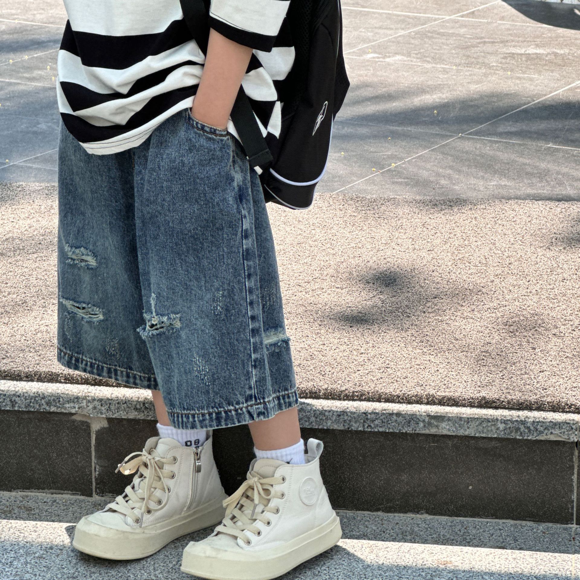 泰如夏季新款韩版男童纯色百搭破洞洋气时尚牛仔短裤儿童裤潮
