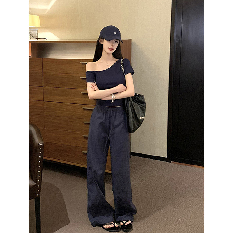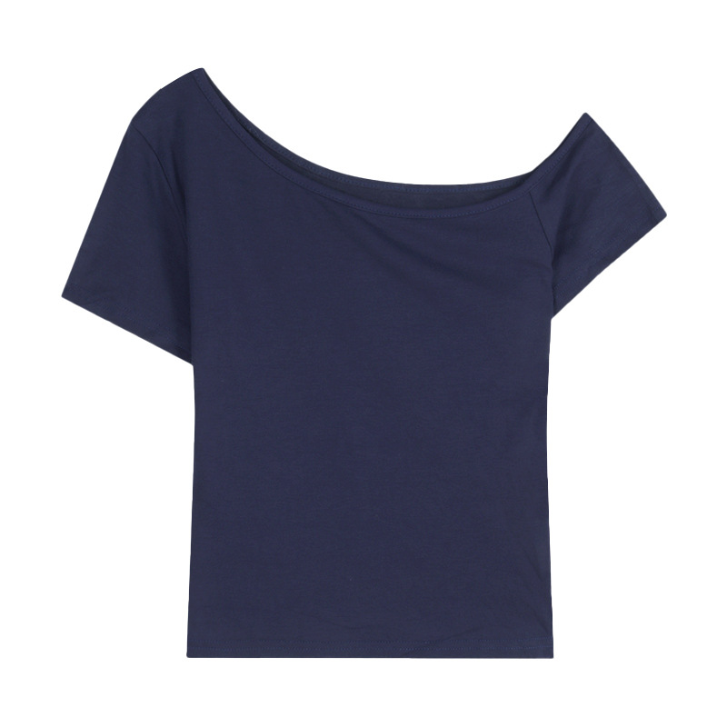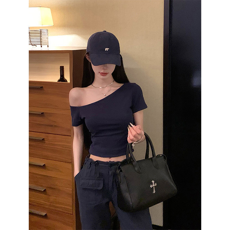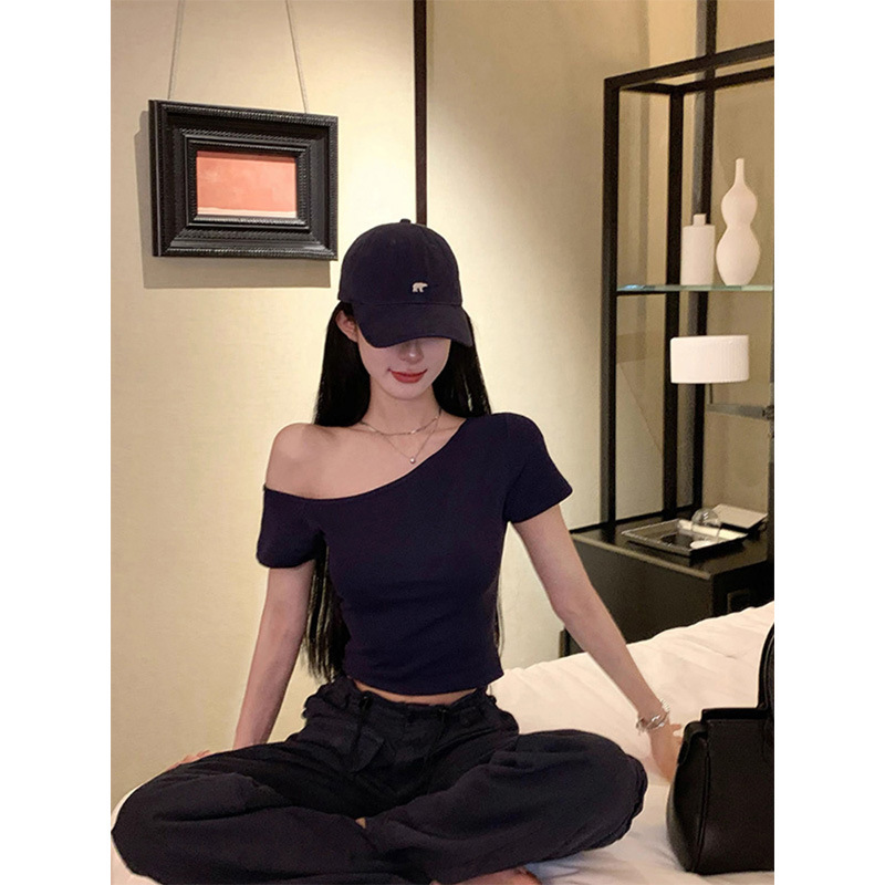 纯棉独特小众斜肩短袖T恤女夏季紧身短款辣妹绝美露肩修身上衣服