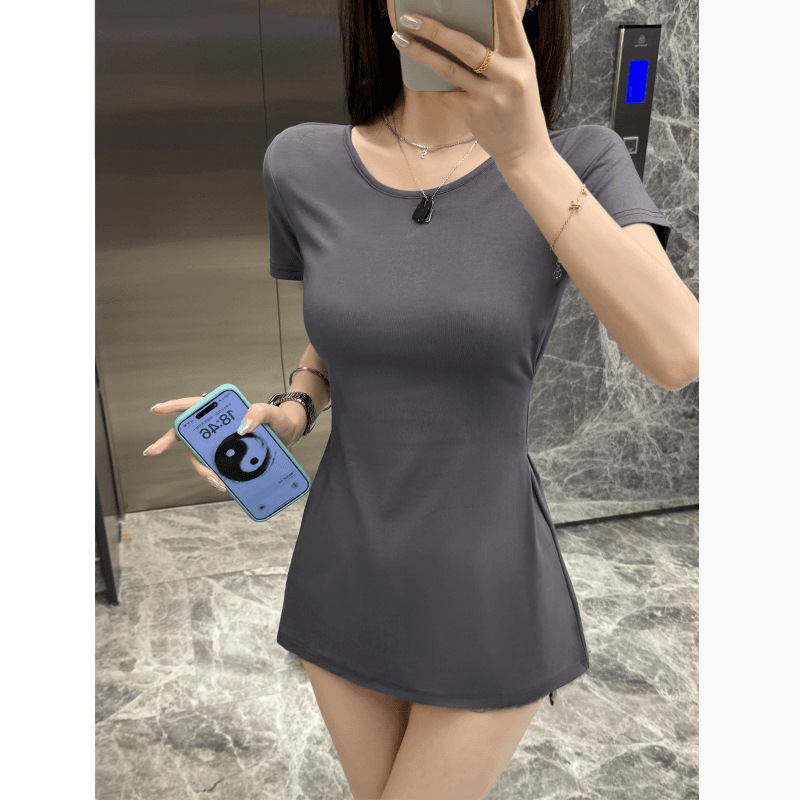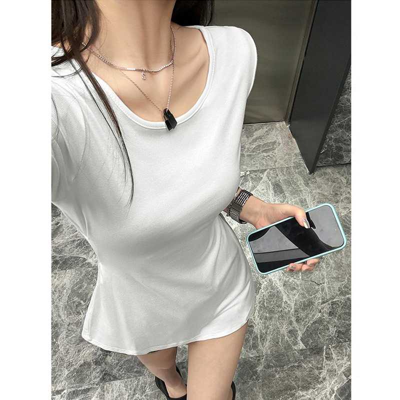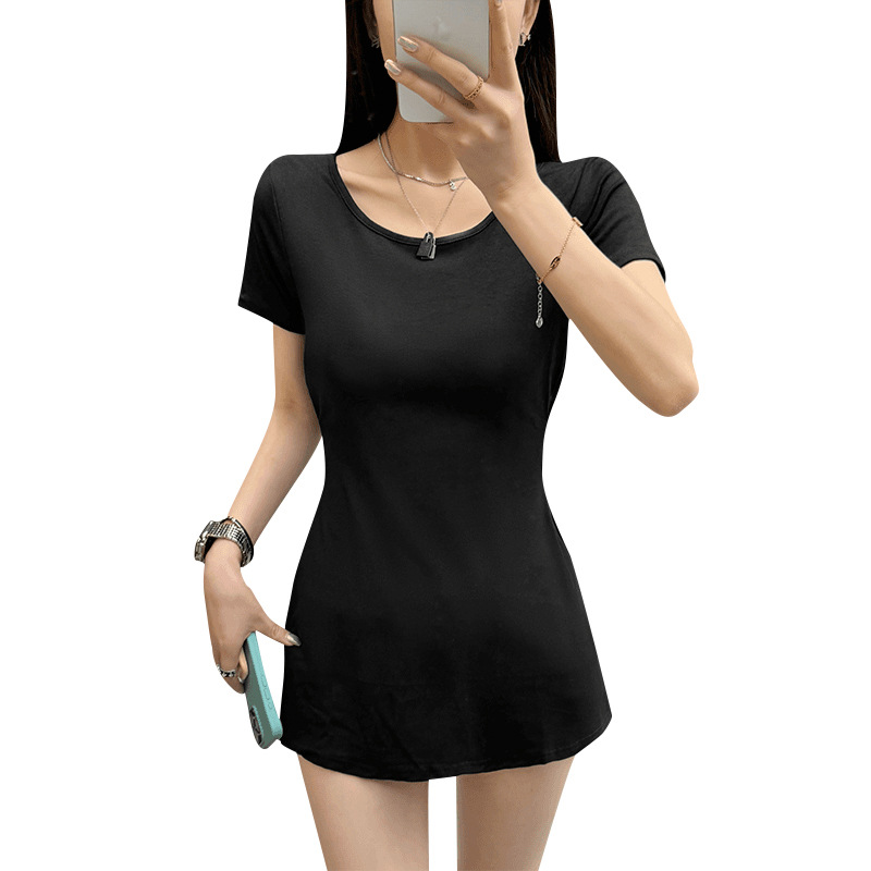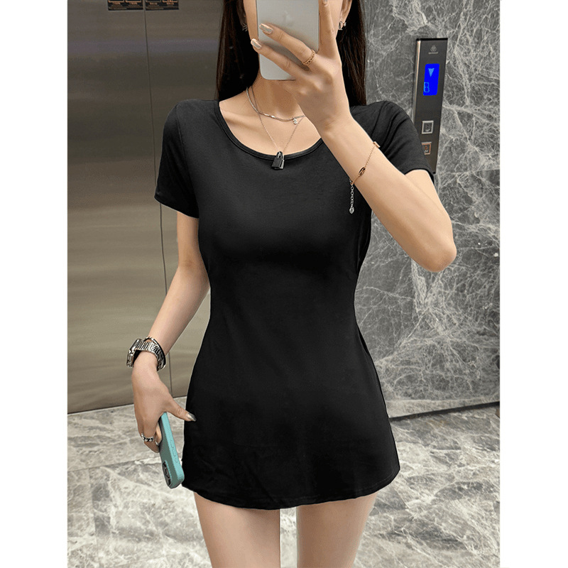 中长款收腰正肩短袖T恤女新款夏季薄款显瘦辣妹百搭打底上衣