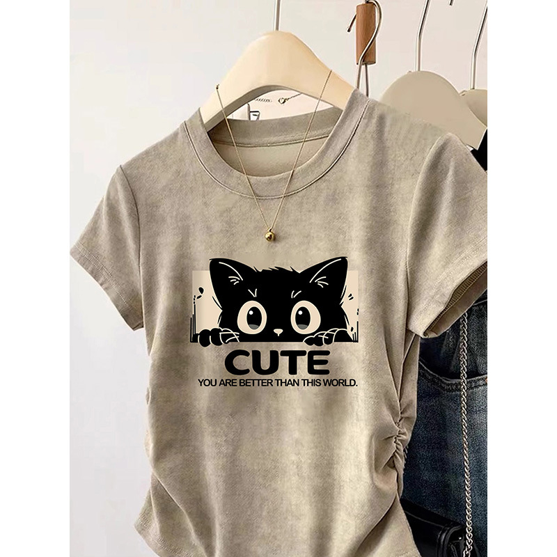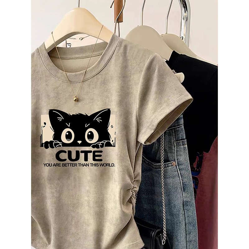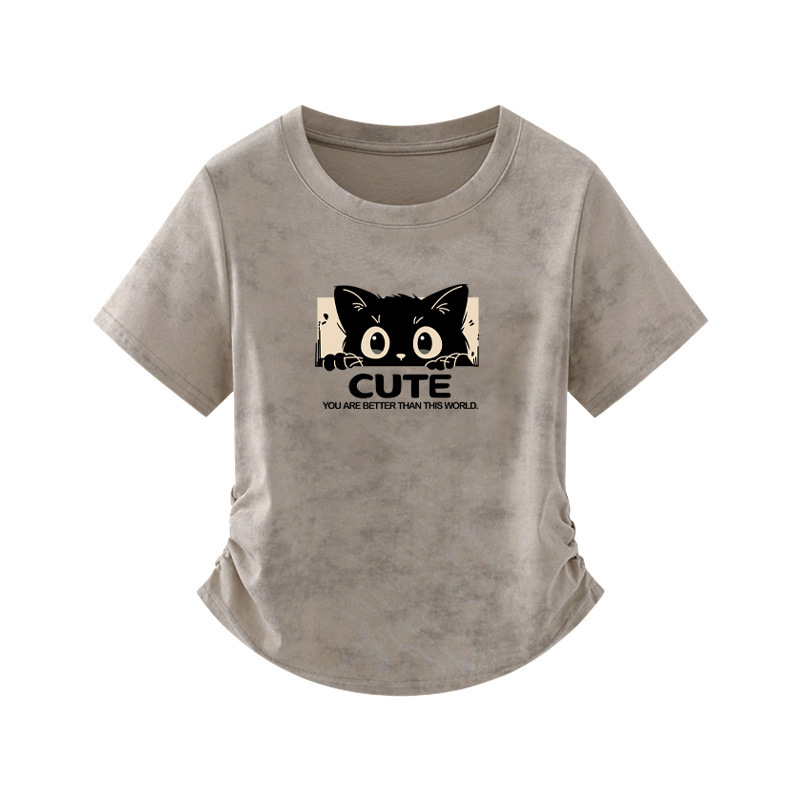 纯棉扎染猫咪短款正肩短袖t恤女夏季设计感小众修身上衣新款