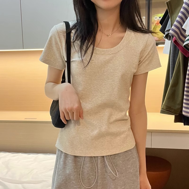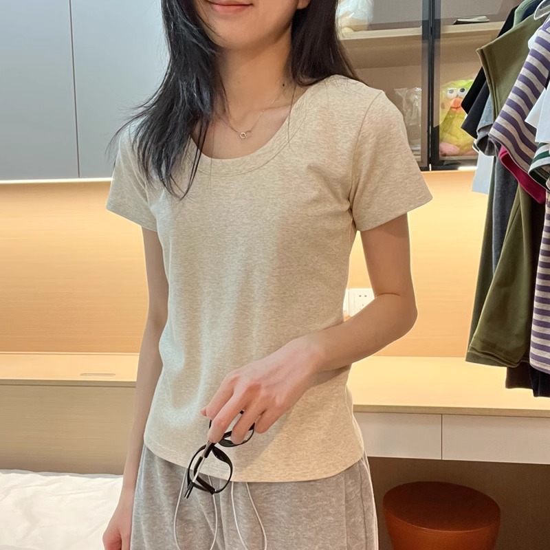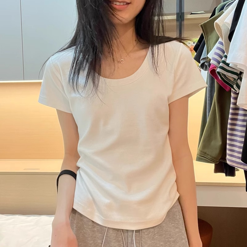 露锁骨U领纯棉短袖T恤女新款夏正肩小个子修身显瘦设计感上衣