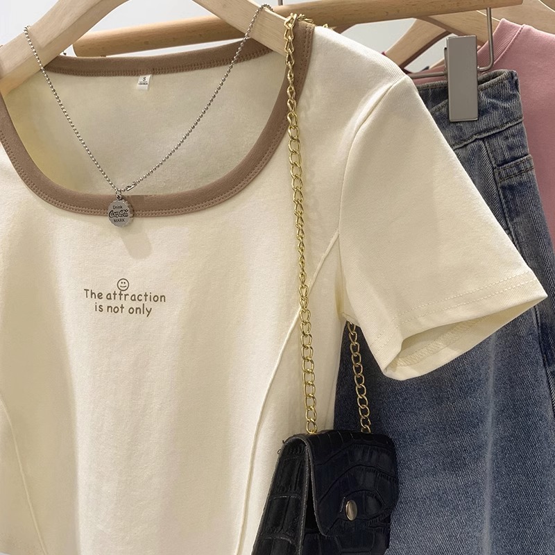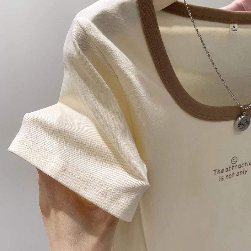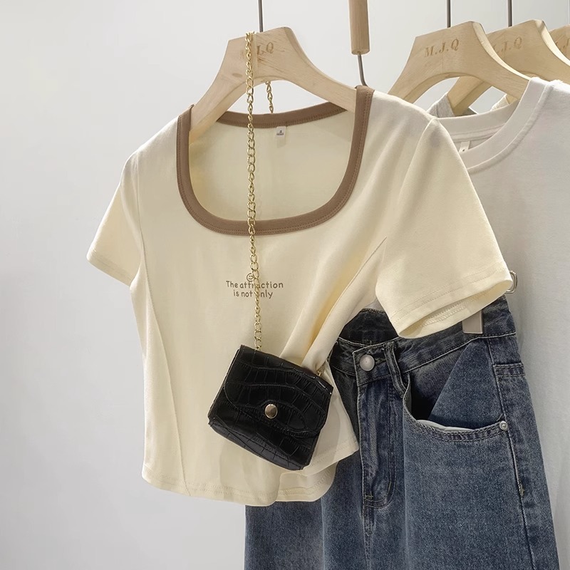 纯棉法式方领撞色正肩t恤女上衣夏设计感鱼骨修身辣妹奶杏色短袖