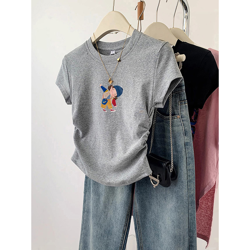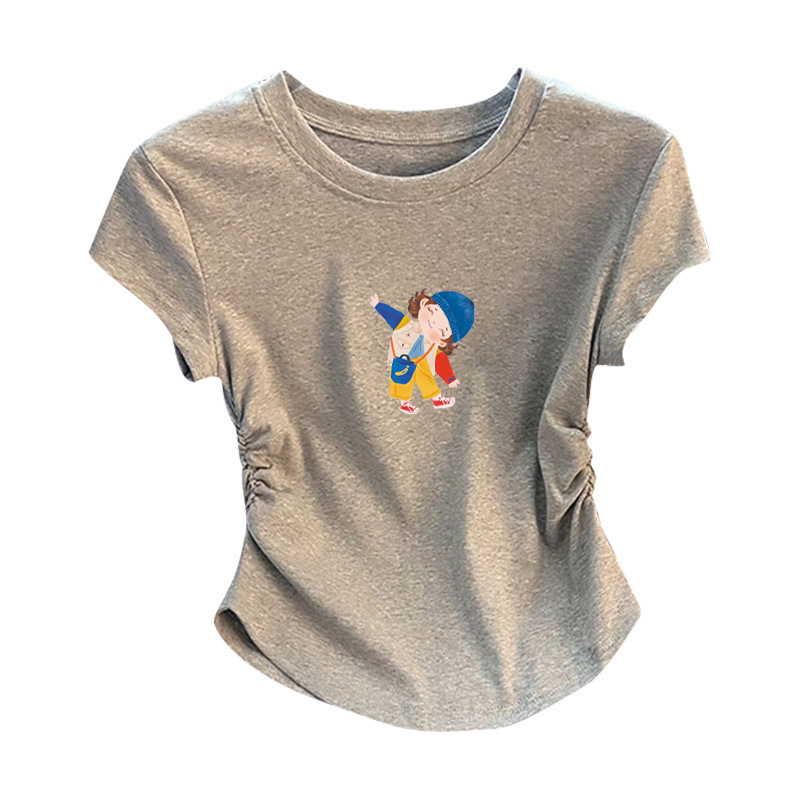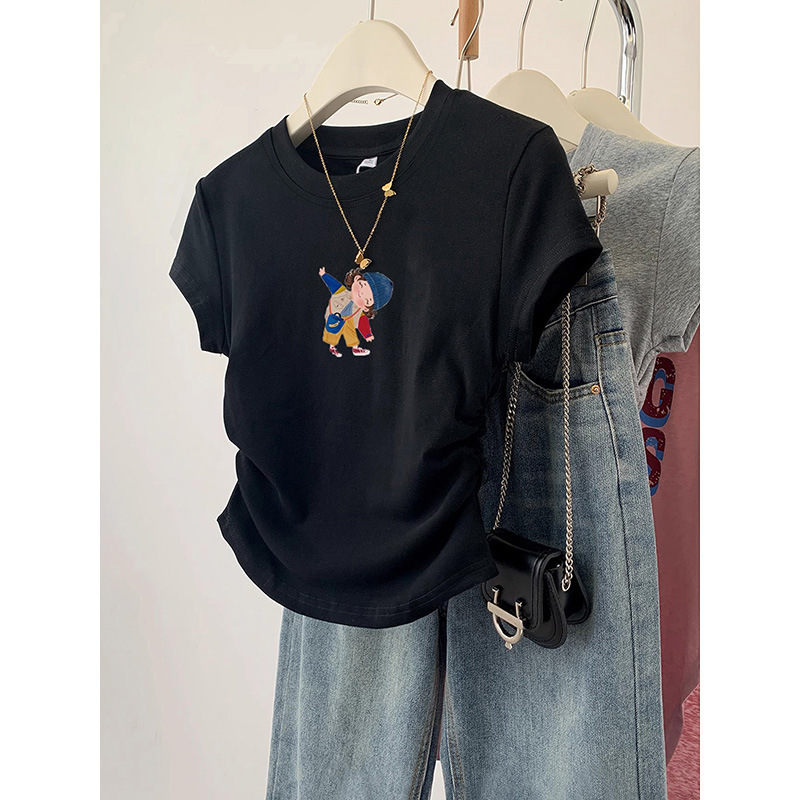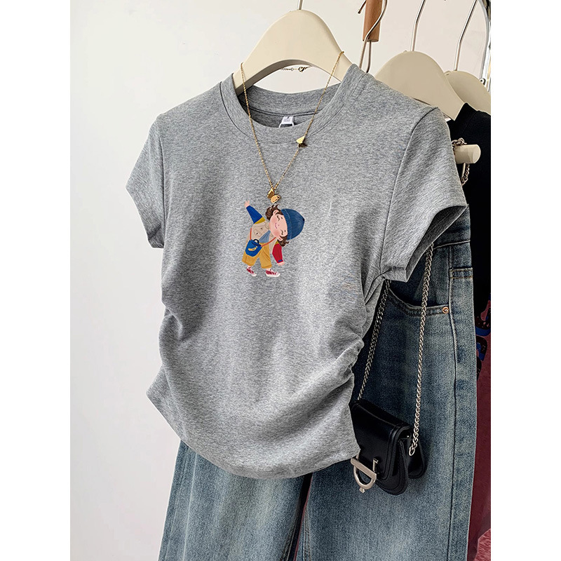纯棉正肩卡通印花T恤女短袖夏修身显瘦褶皱收腰设计感不规则上衣