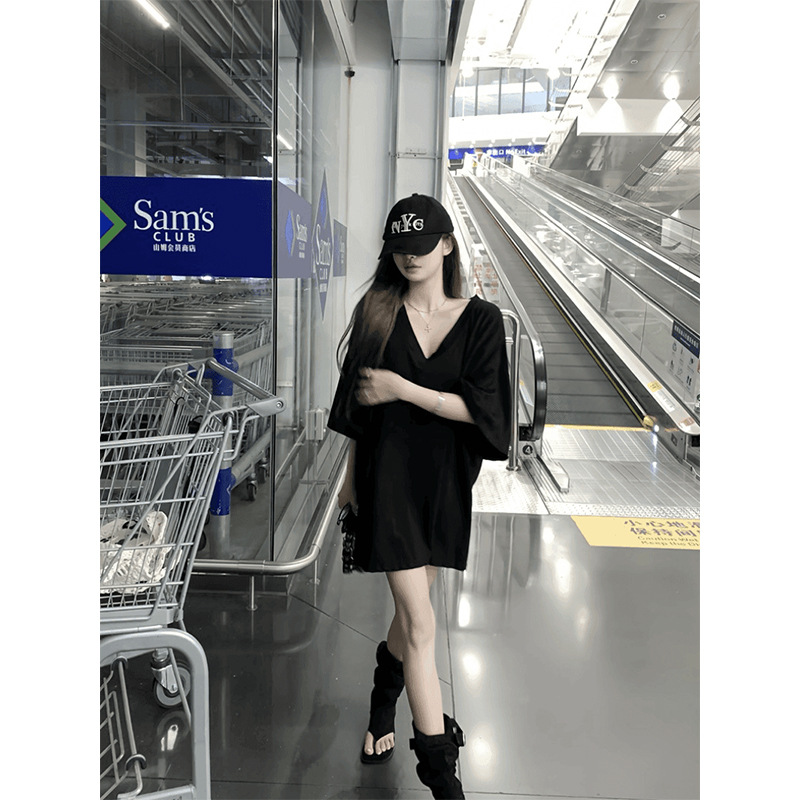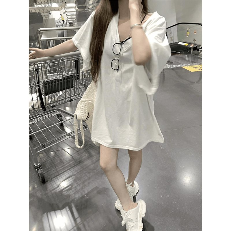 大V领韩版oversize中长款短袖T恤女夏季下衣失踪宽松休闲百搭上衣