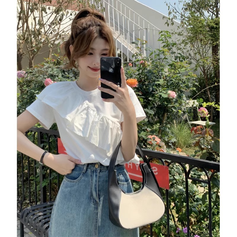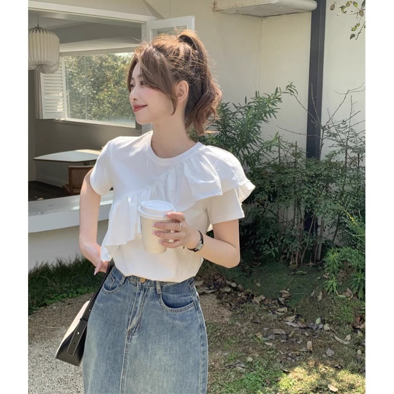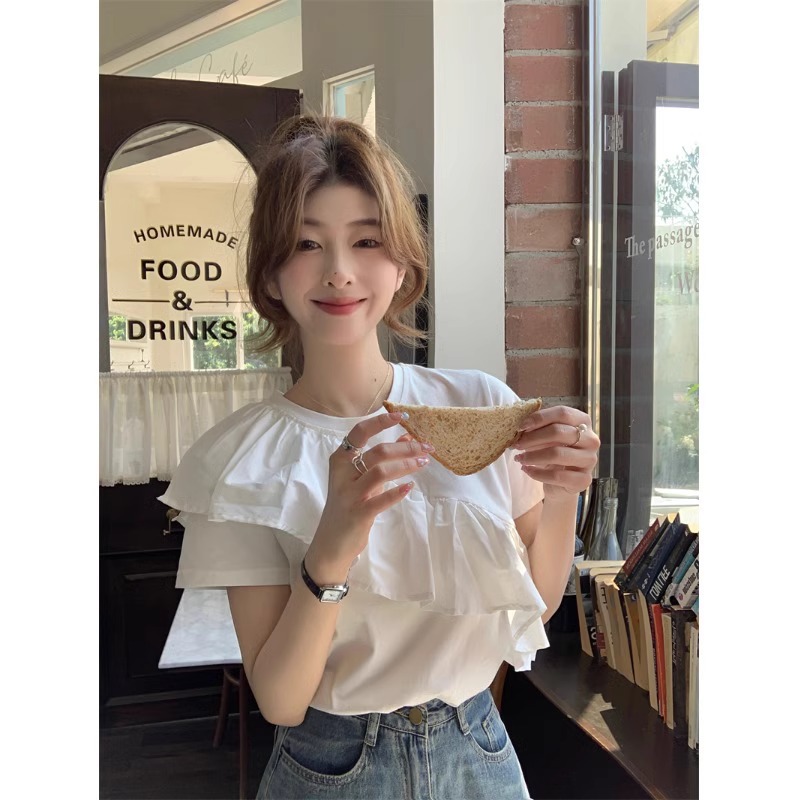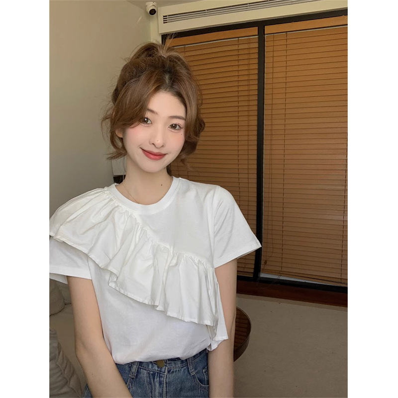 荷叶边短袖纯棉T恤女法式别致独特设计感小众短款上衣夏正肩体恤