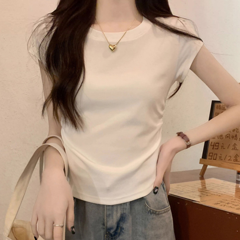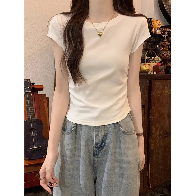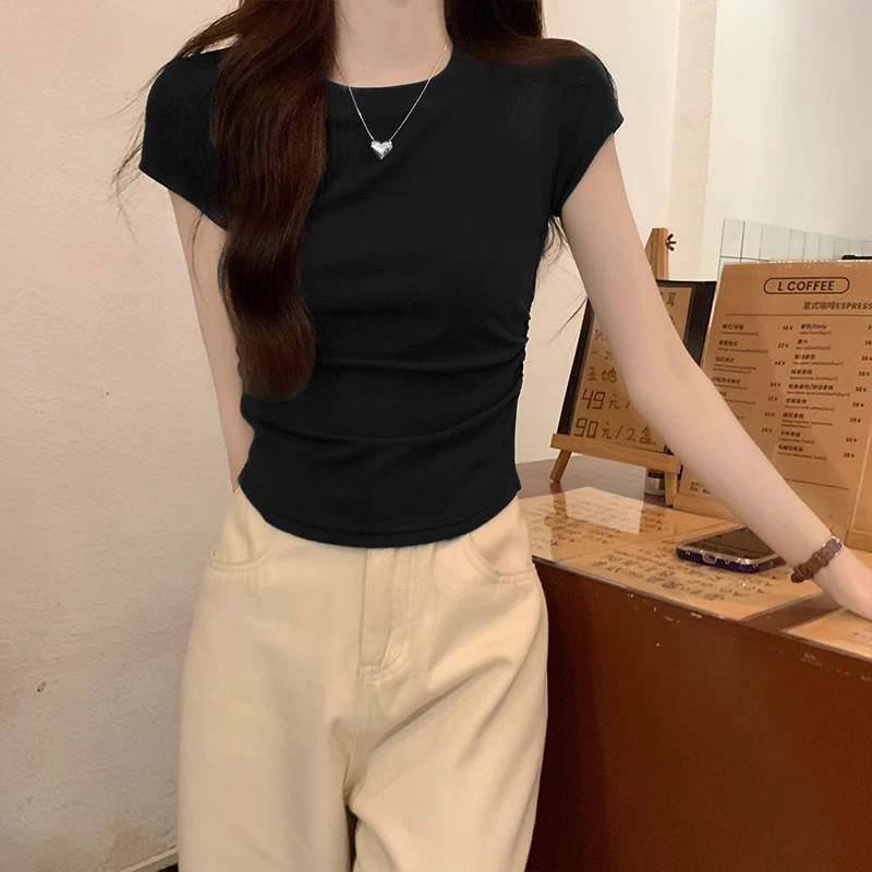 正肩短袖T恤女夏季紧身褶皱显瘦不规则设计感短款小个子体桖上衣