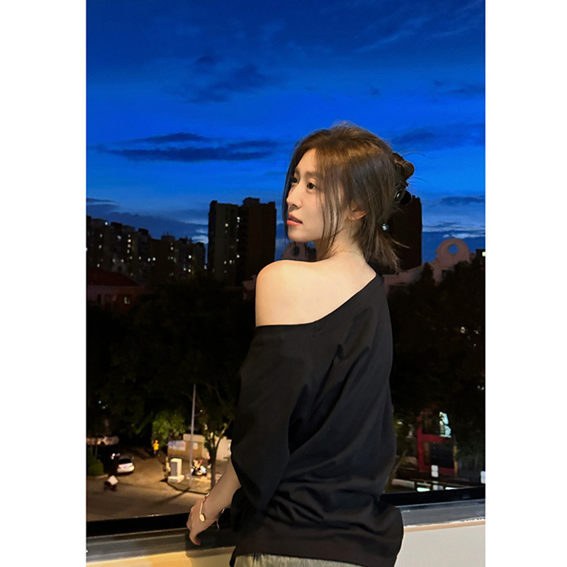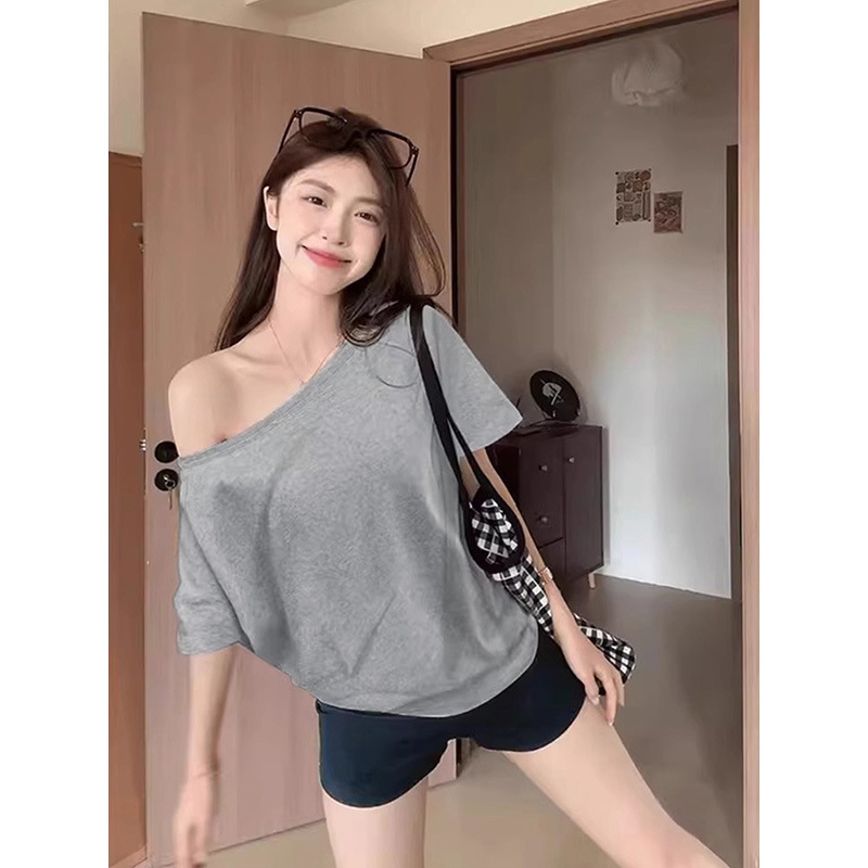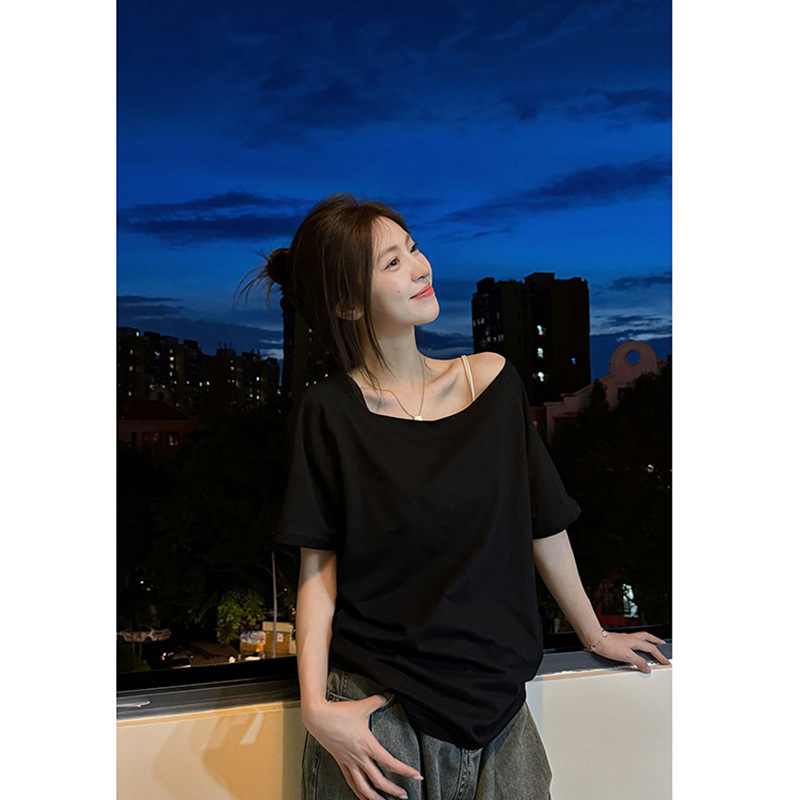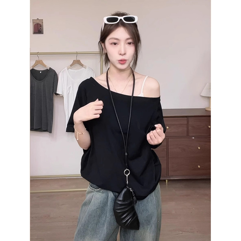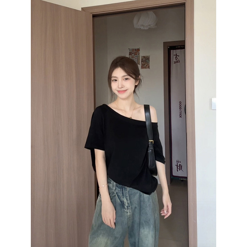 设计感小众辣妹纯棉露肩短袖T恤女夏季宽松休闲简约百搭斜肩上衣