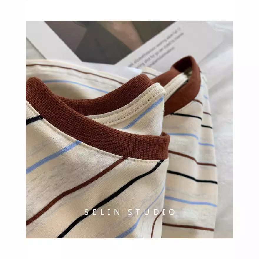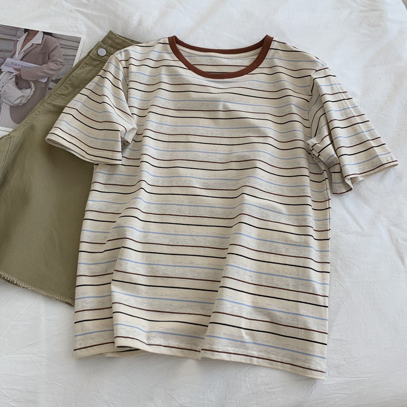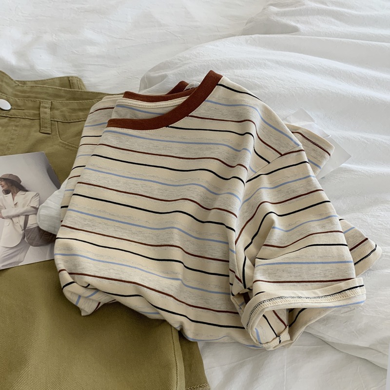 复古条纹撞色减龄T恤女夏季宽松显瘦chic港风正肩短袖纯棉上衣服