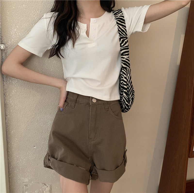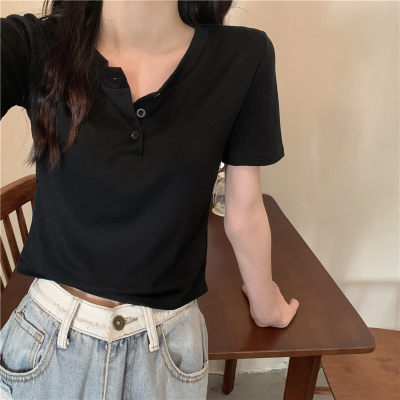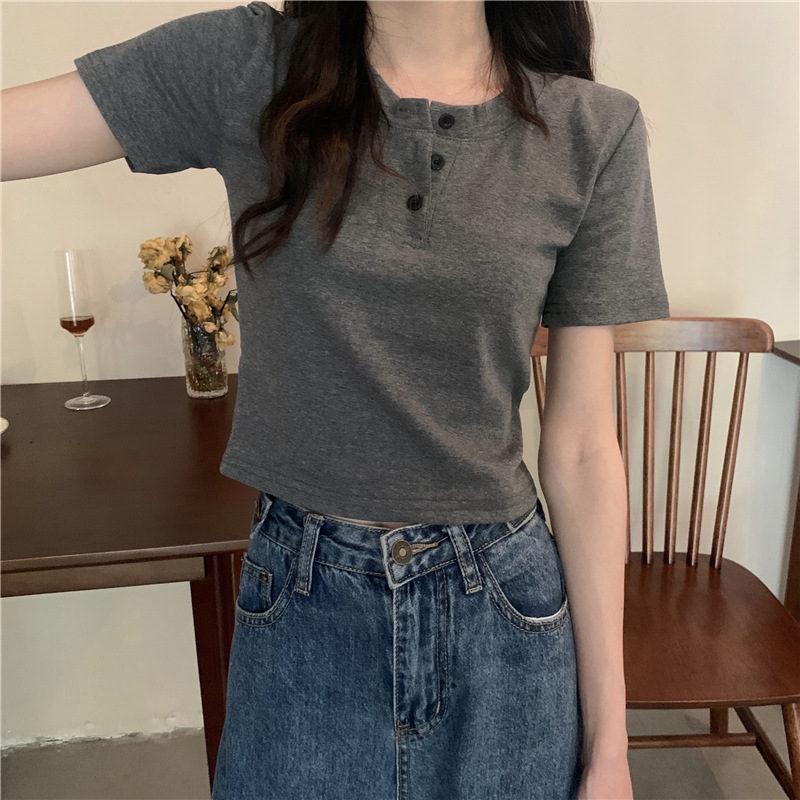 灰色短袖T恤女年夏季新款韩版修身高腰短款纯棉纽扣体桖上衣
