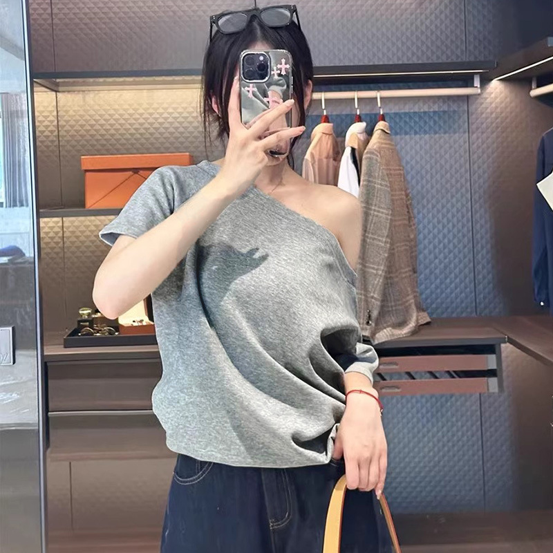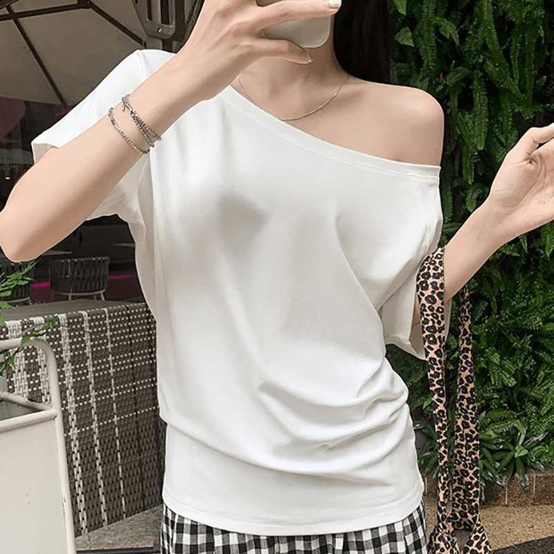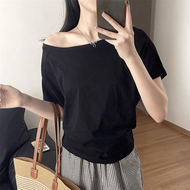 纯棉一字领斜肩短袖T恤女夏露肩上衣大领口宽松设计感张婧仪同款