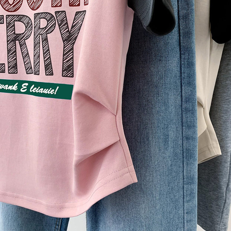 纯色纯棉中长款下摆破洞短袖t恤女宽松夏季宽松卷边半袖上衣