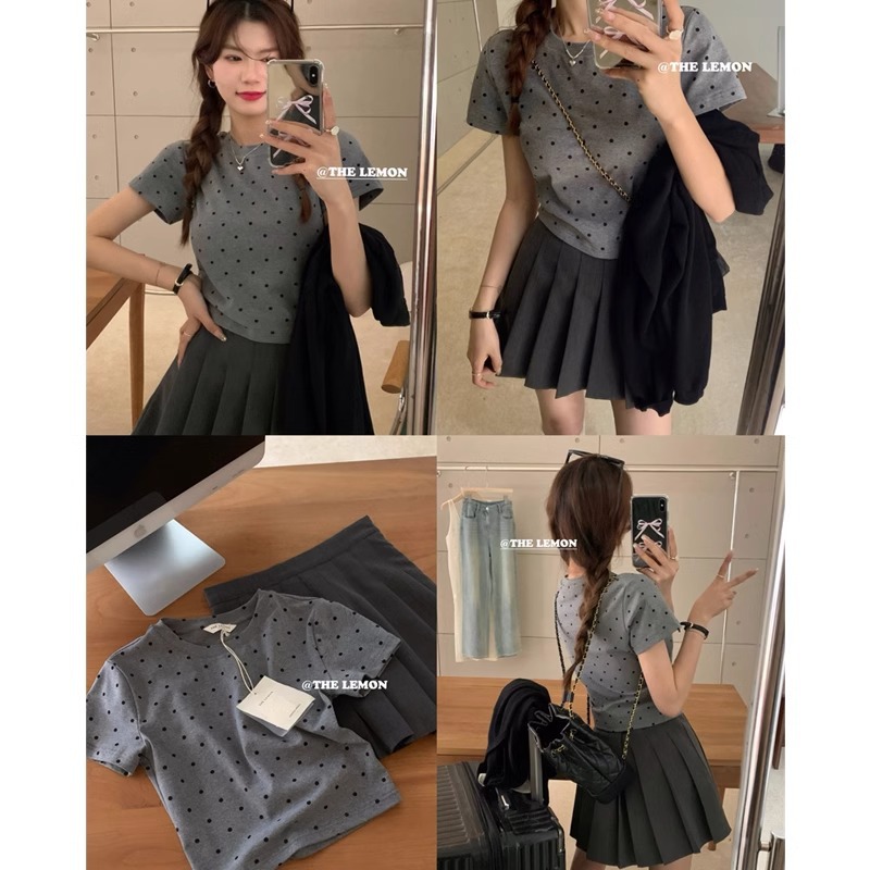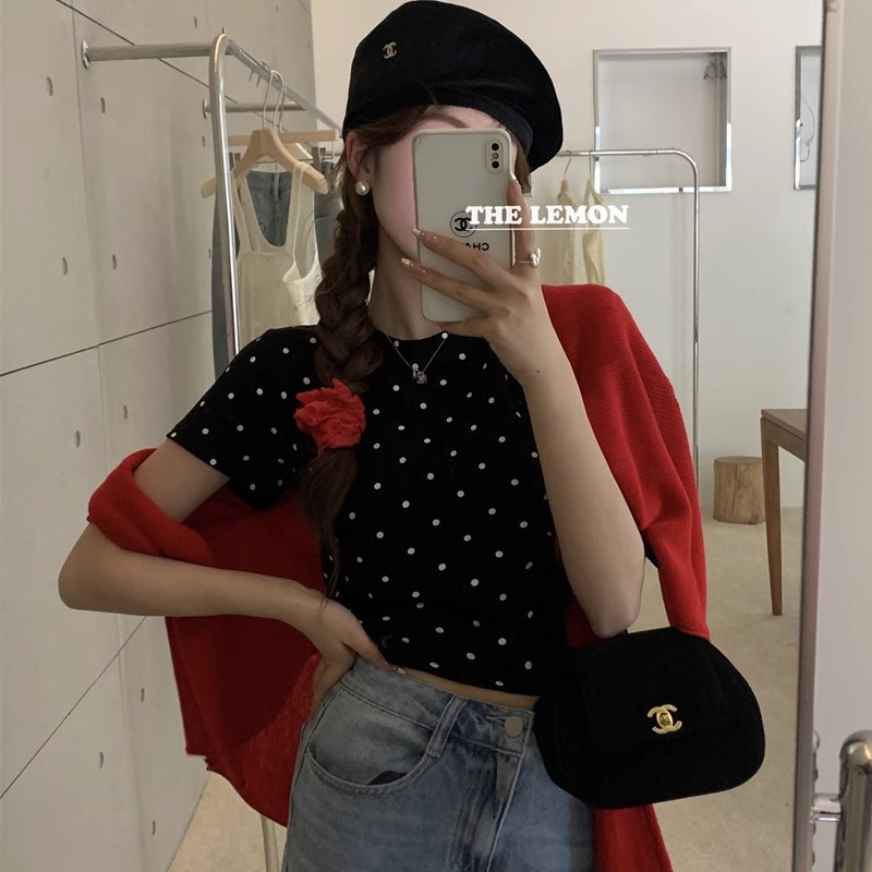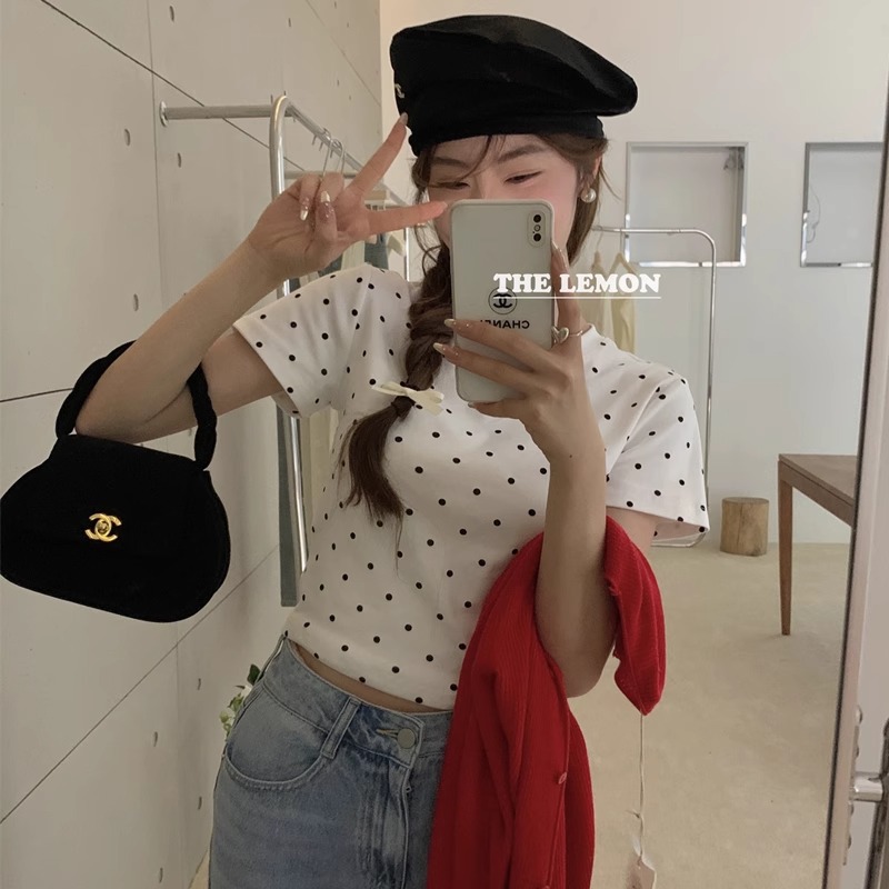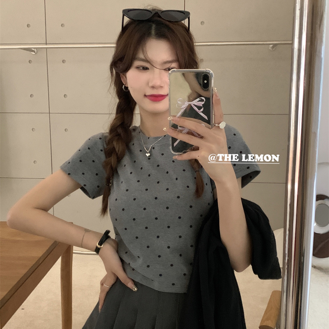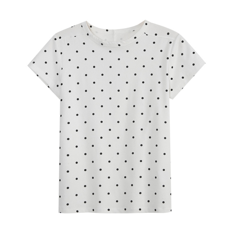 纯棉韩系波点设计感正肩短袖女夏季小个子百搭圆领t恤通勤上衣ins