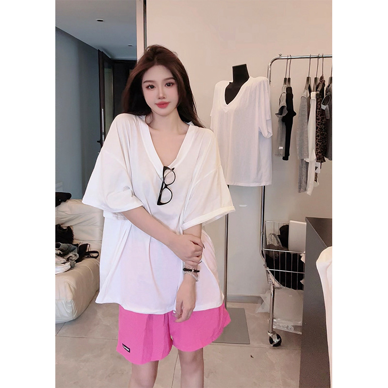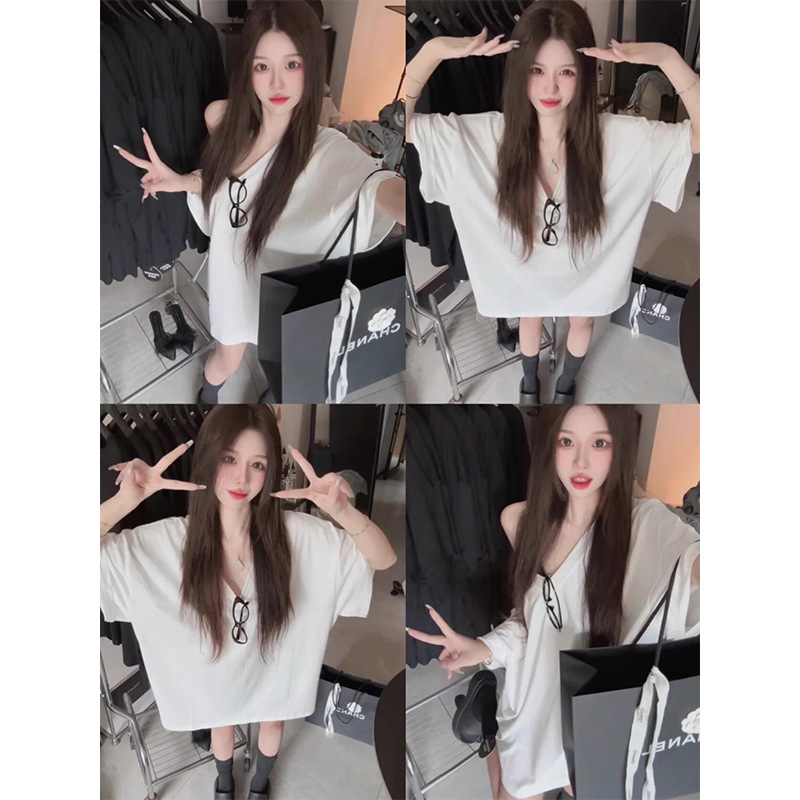 大版白色短袖v领t恤女新款爆款夏季宽松中长款遮屁股下衣失踪