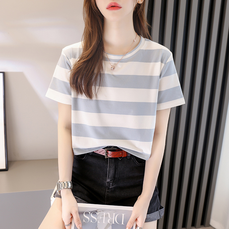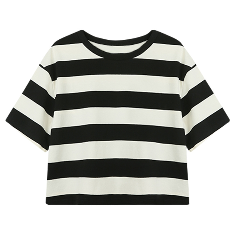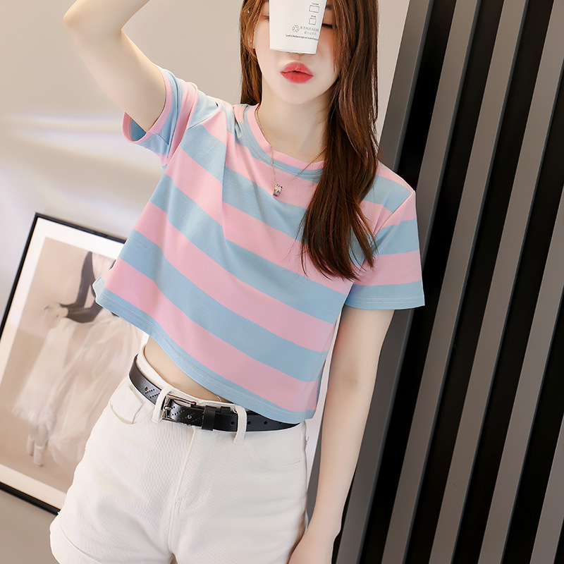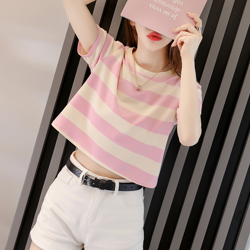 短袖t恤女纯棉夏季新款宽松小个子设计感小众短款正肩条纹上衣桖