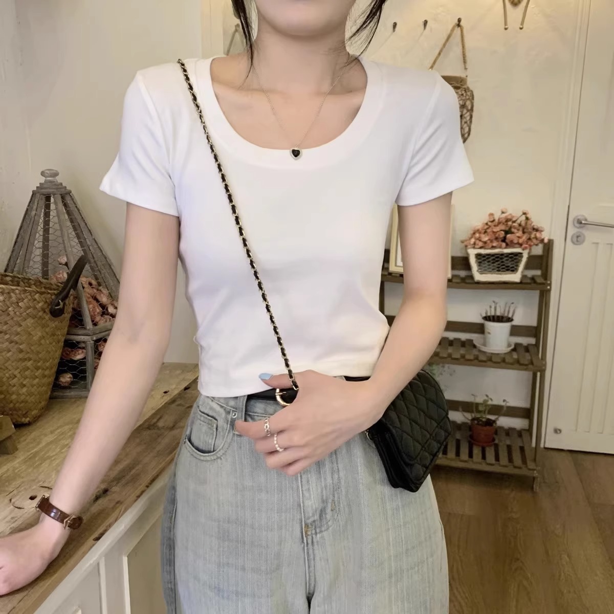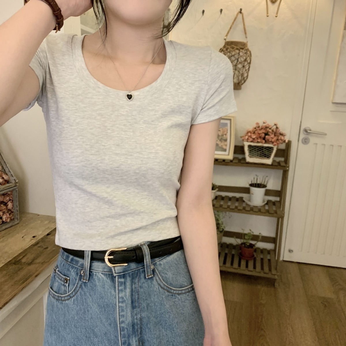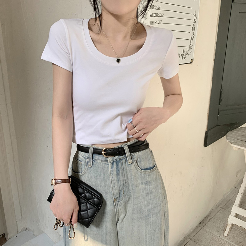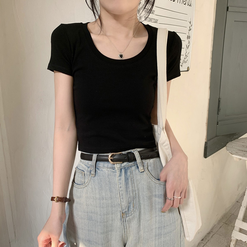 纯欲风修身短袖T恤女夏季基础款U领灰色圆领体桖百搭显瘦短款上衣