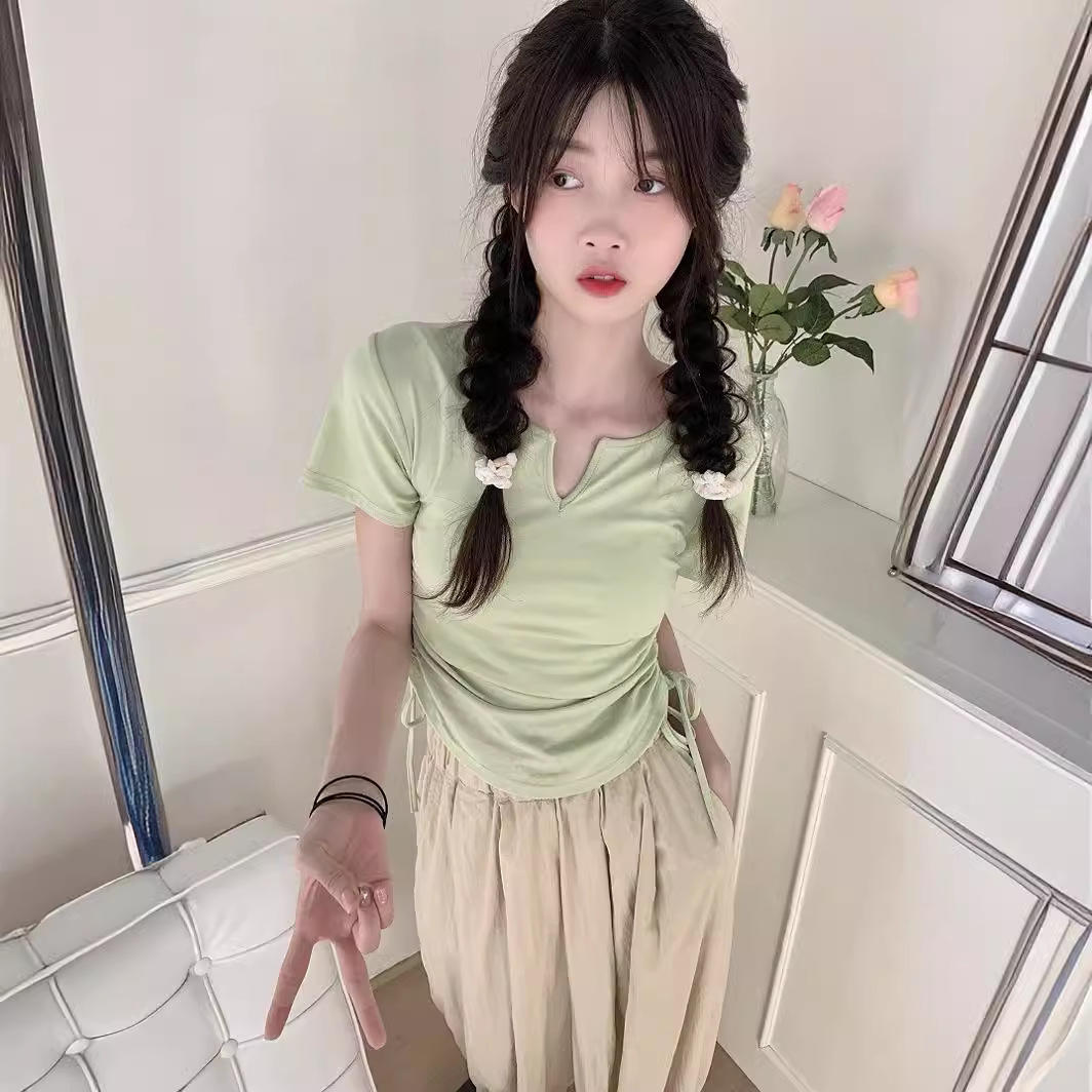 小个子V领短袖T恤女夏季新款修身显瘦设计感小众辣妹正肩上衣