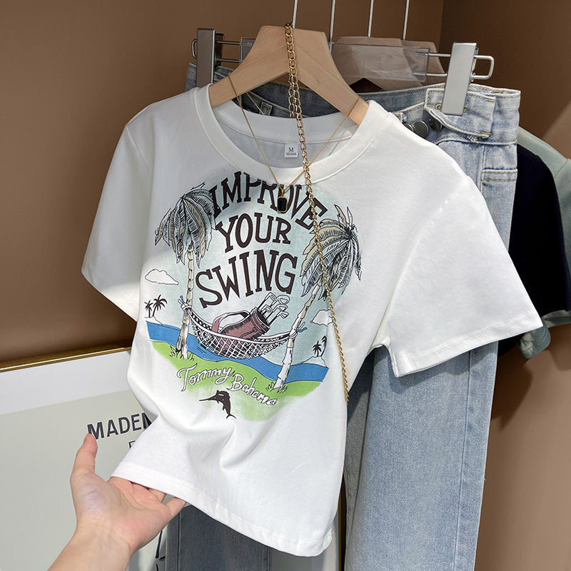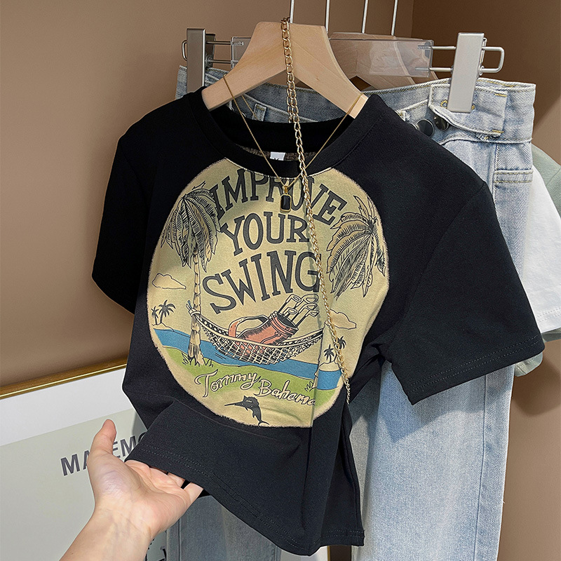 正肩短袖T恤女夏季设计感小众美式复古修身显瘦辣妹短款纯棉上衣
