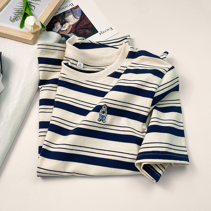 条纹短袖T恤女夏季撞色设计感小众显瘦正肩纯棉体桖刺绣宽松上衣