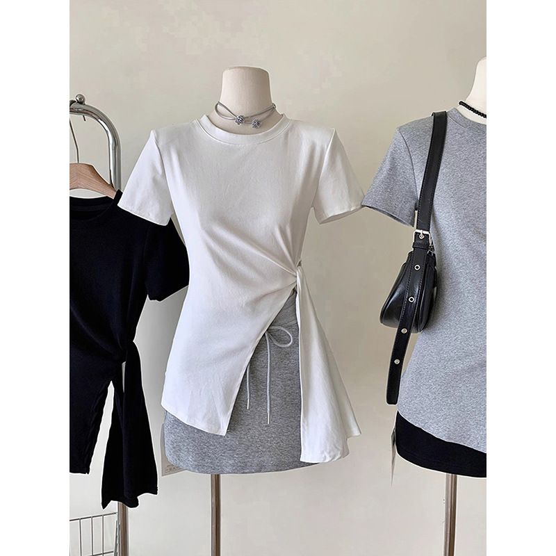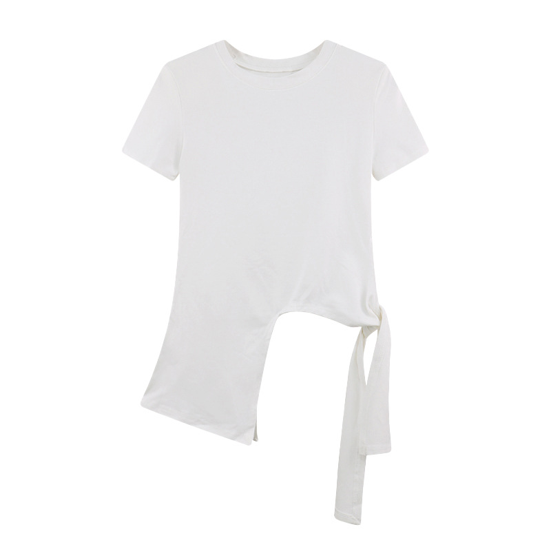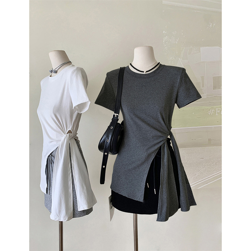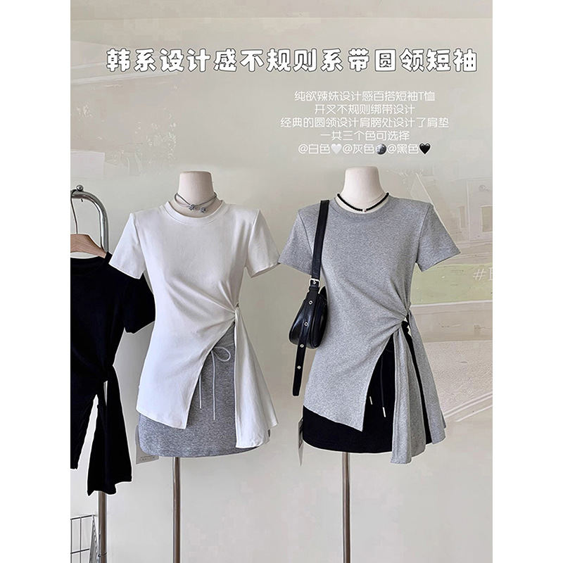 纯棉不规则开叉收腰短袖T恤大码胖mm设计感显瘦遮肉今年流行上衣