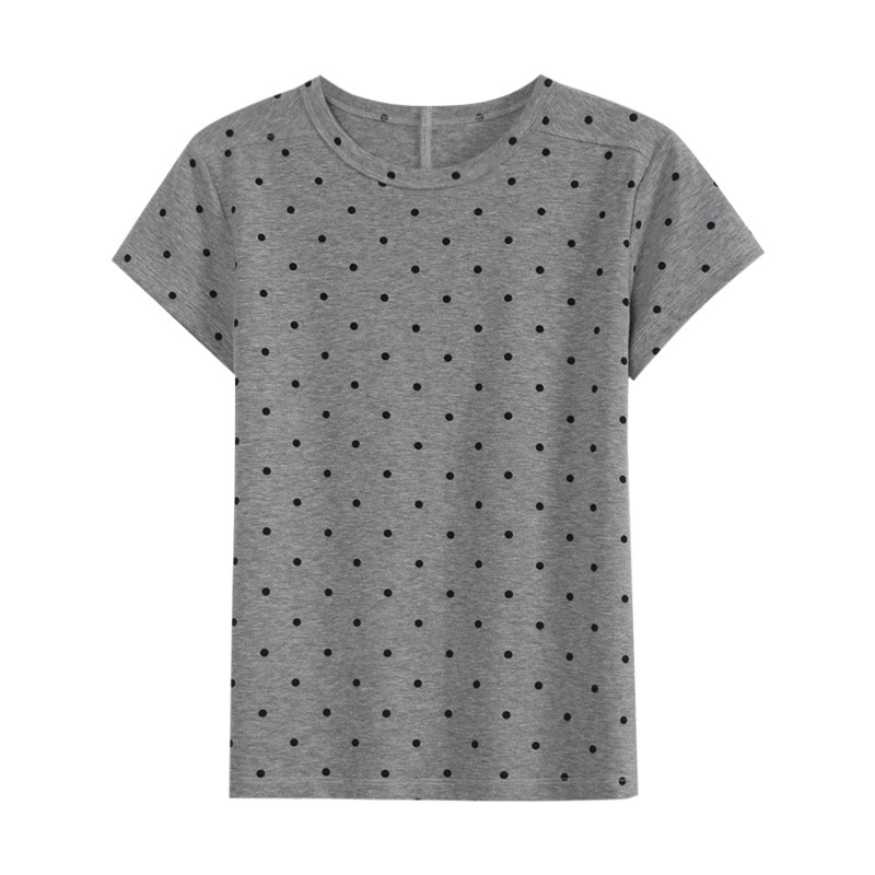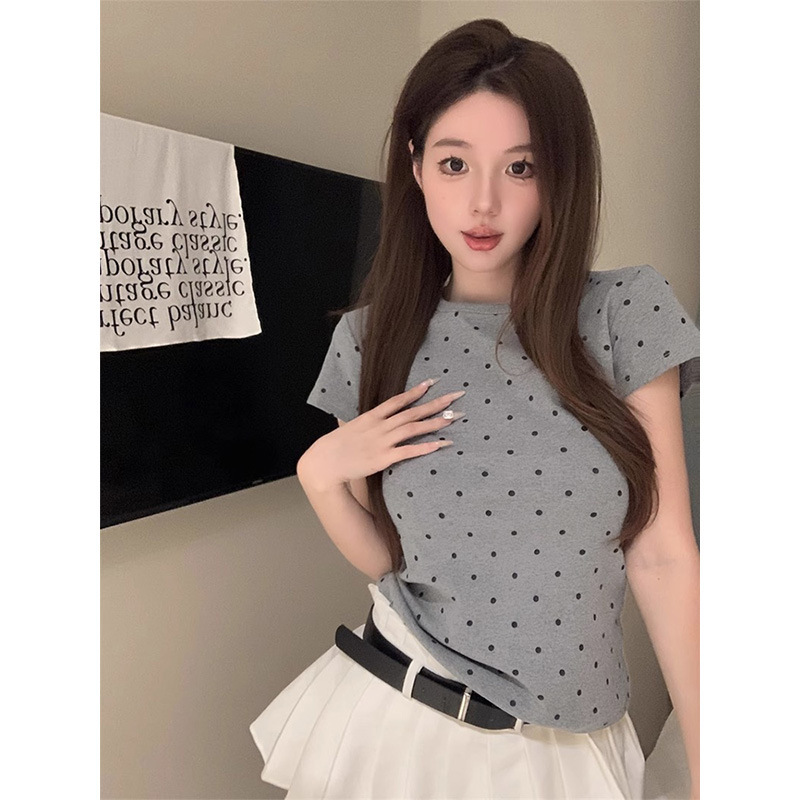 纯棉纯欲圆领波点套头短袖t恤女夏季年新款修身短款复古上衣