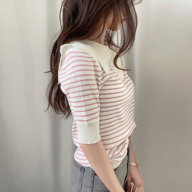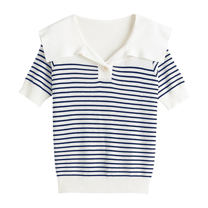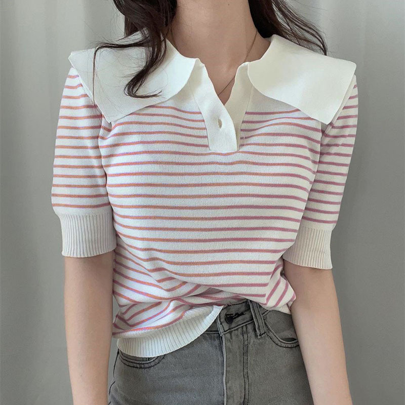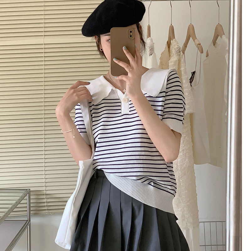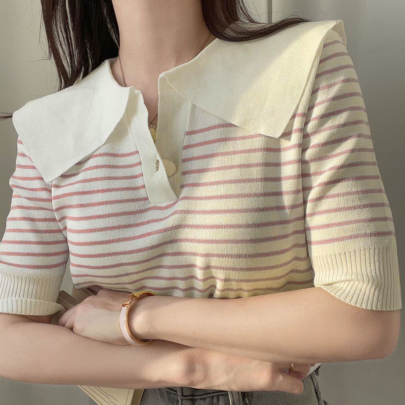 polo领条纹冰丝针织衫女薄款夏季设计感小众宽松短袖t恤半袖上衣