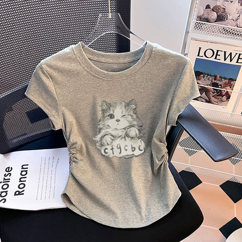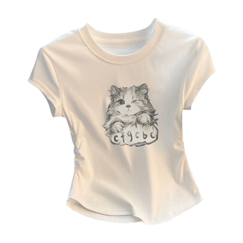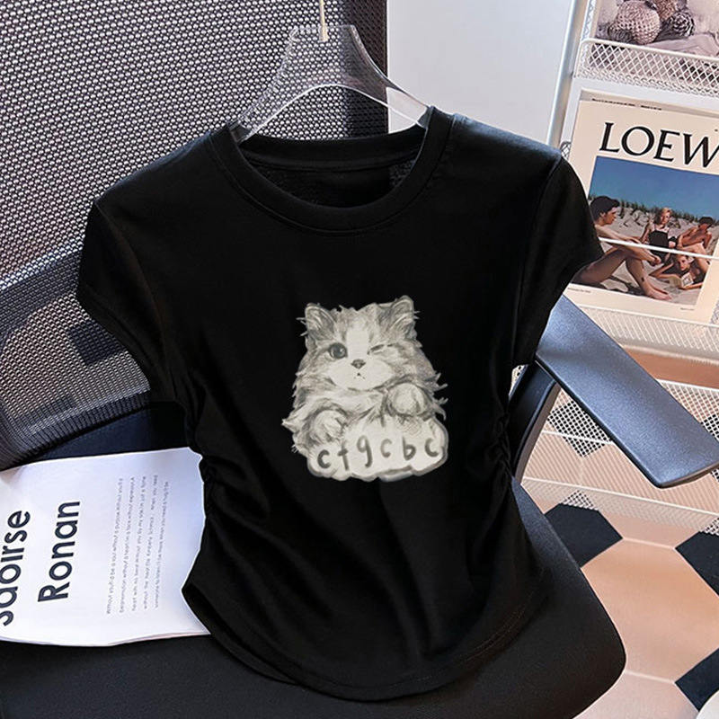 纯棉短袖女设计感小众猫咪印花短袖t恤夏季修身正肩别致漂亮上衣