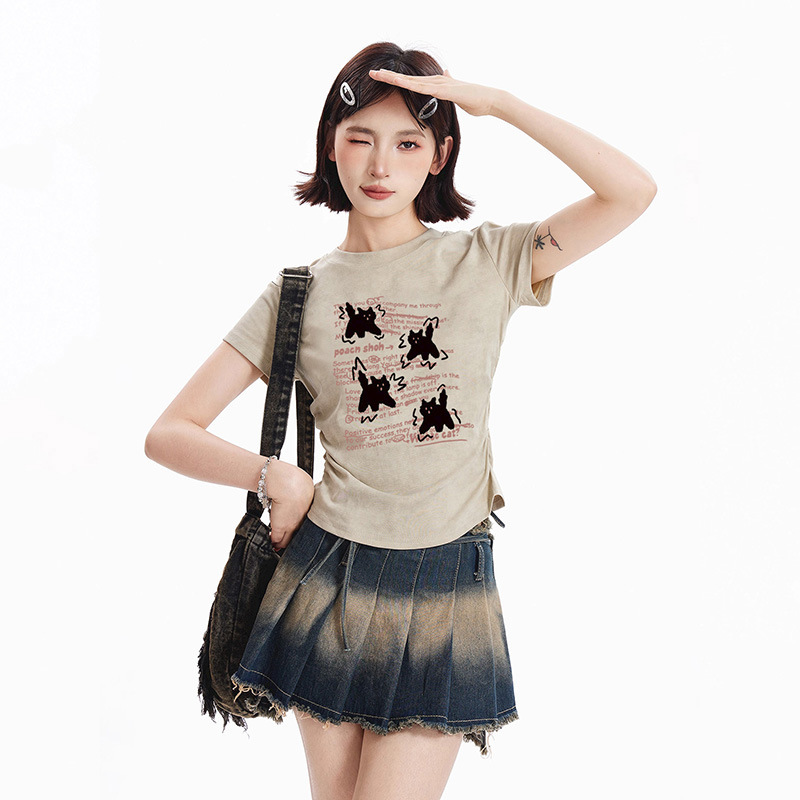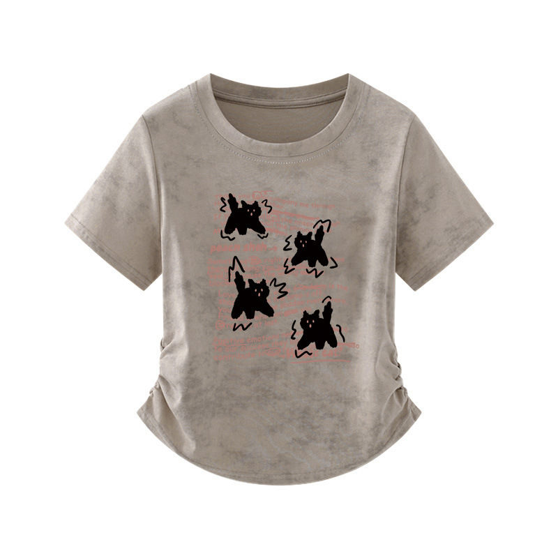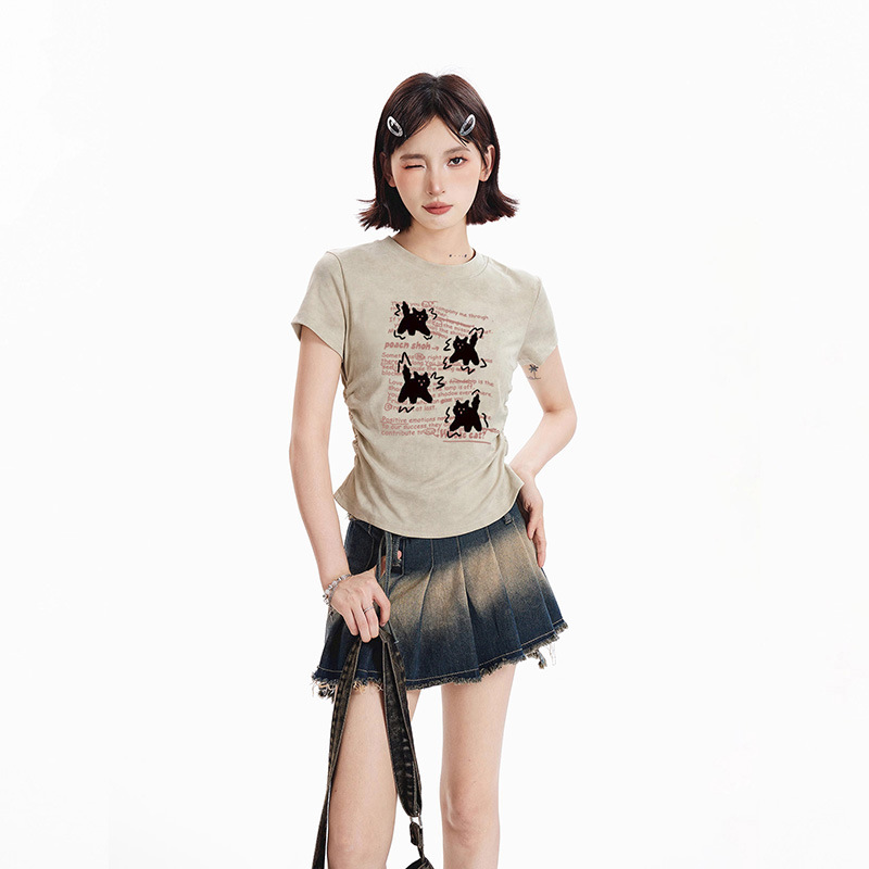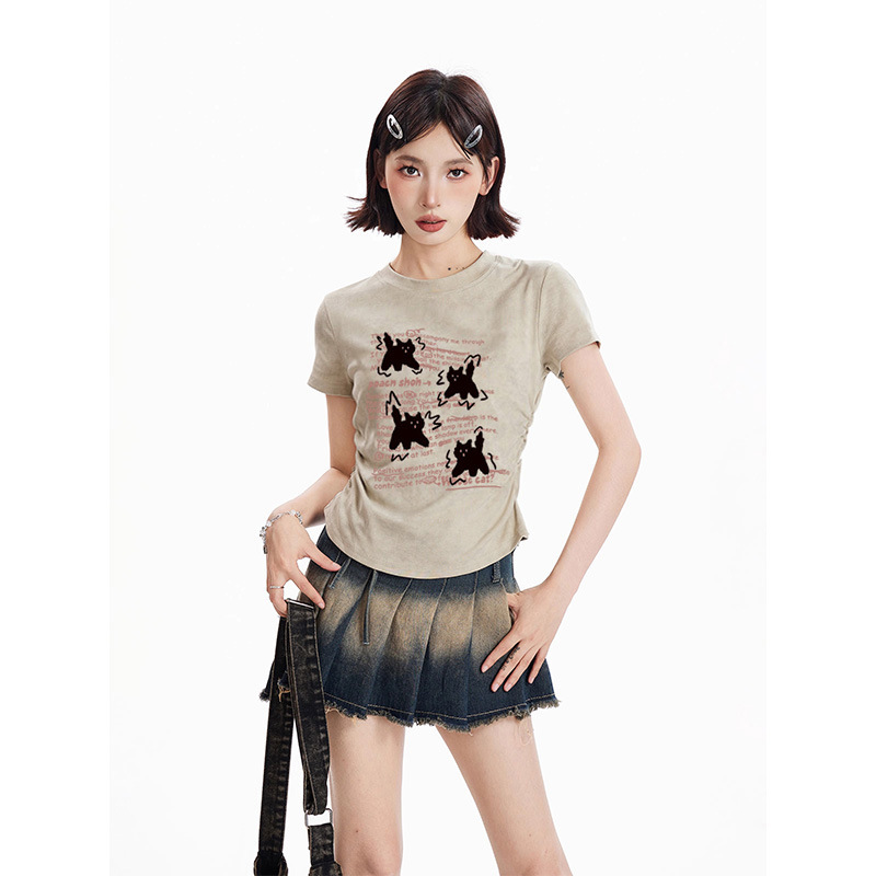 美式复古正肩短袖T恤女夏季新款水洗印花做旧慵懒宽松中长款