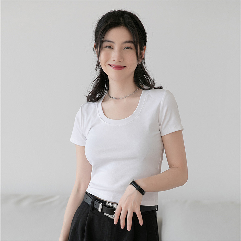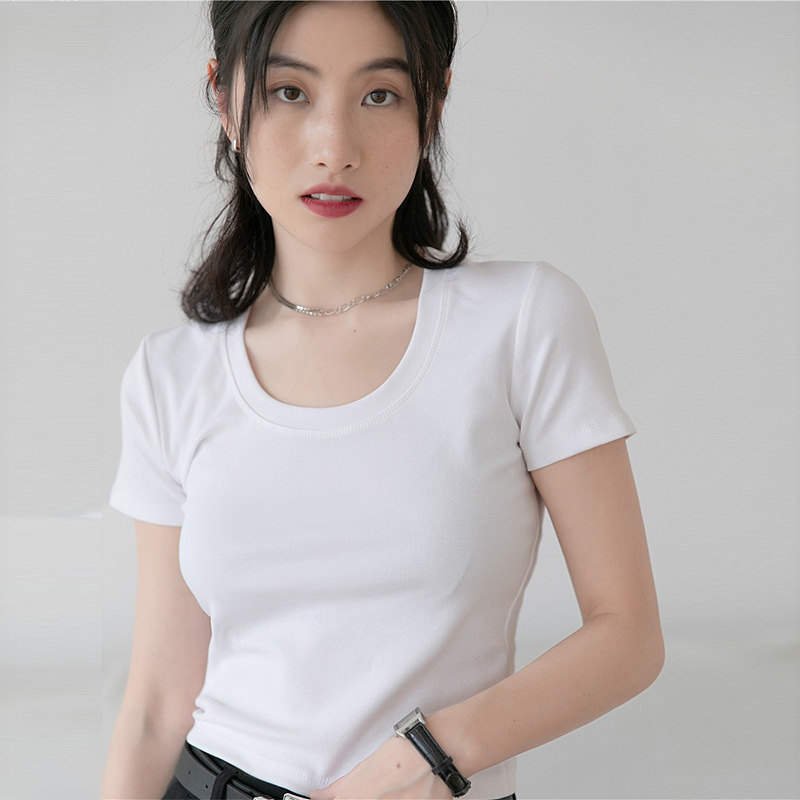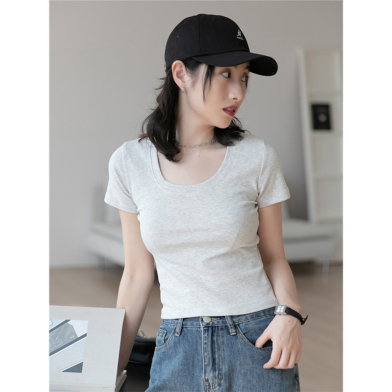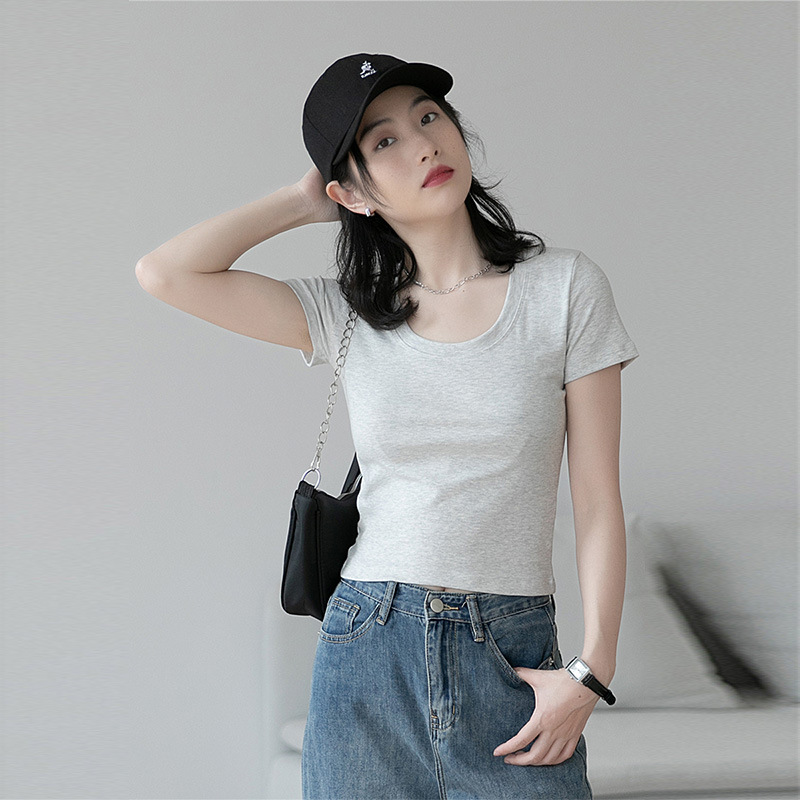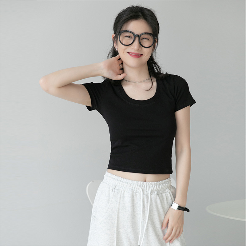 正肩短袖U领短款T恤女夏季修身辣妹露脐高腰半袖体恤打底上衣服