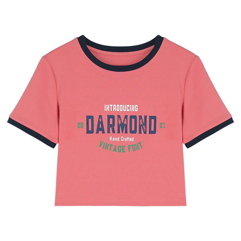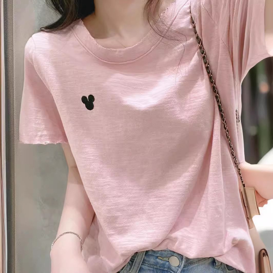 圆领刺绣竹节棉粉色短袖T恤女装夏天宽松显瘦正肩基础款上衣