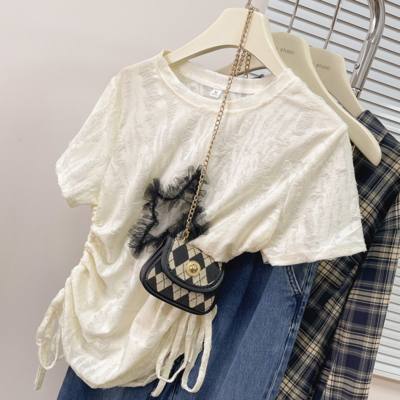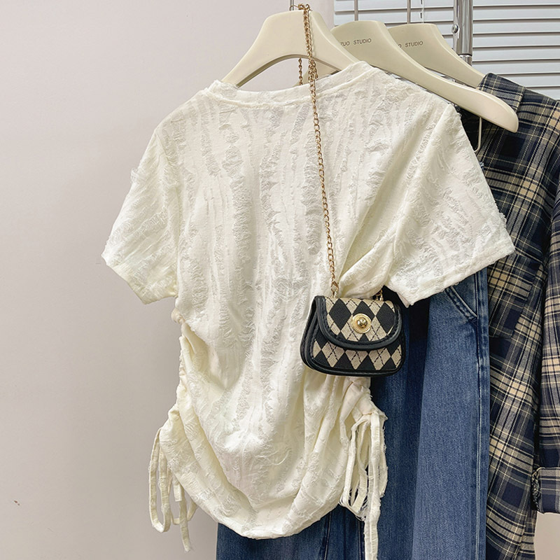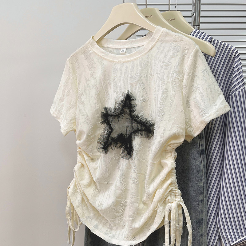正肩抽绳星星短袖T恤女新款夏季设计感小众甜辣妹风半袖体恤