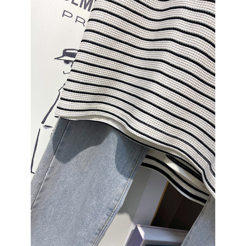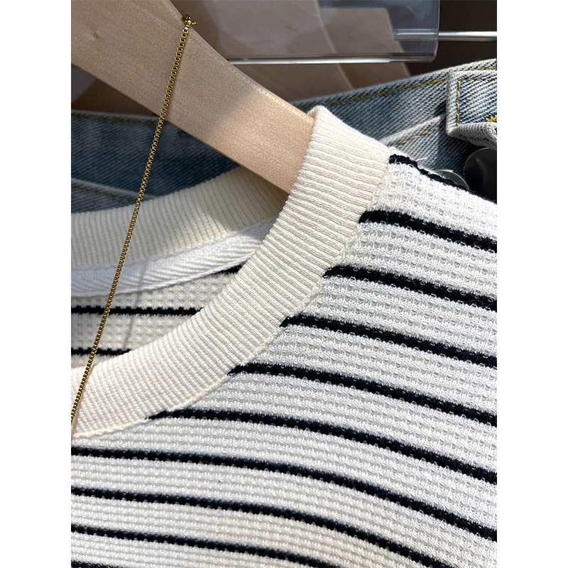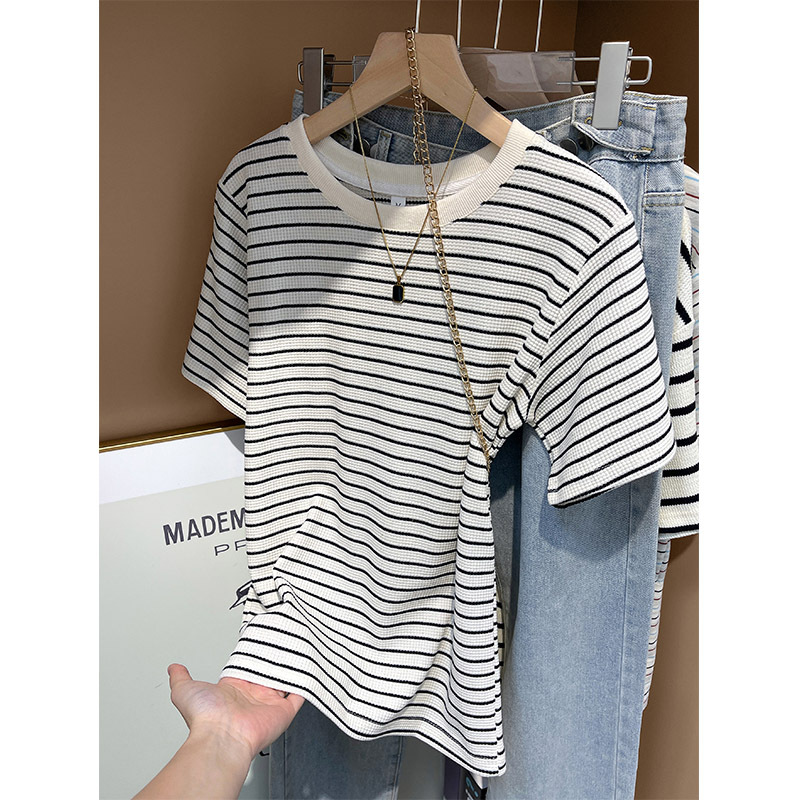 纯棉条纹t恤女短袖华夫格宽松显廋夏新款文艺女体恤休闲半袖