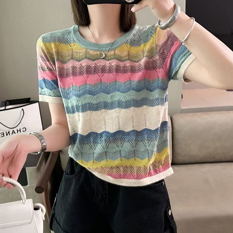 彩色条纹体恤上衣女短袖夏装新款百搭薄款镂空冰丝针织T恤女小衫