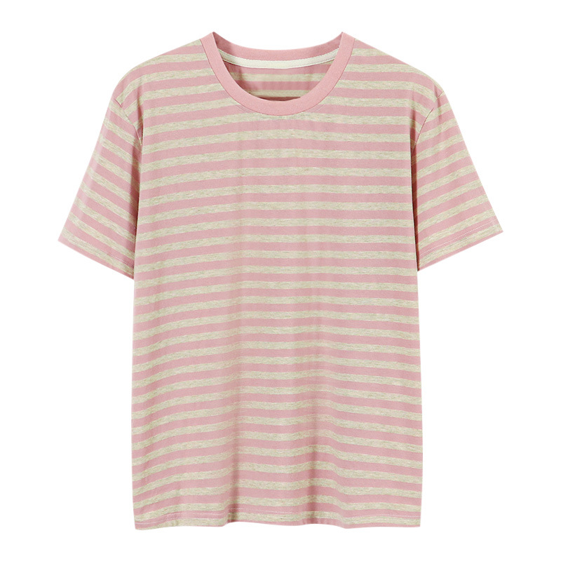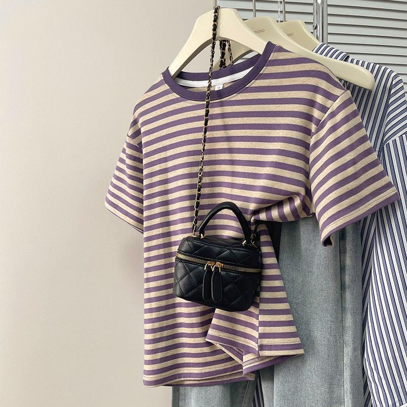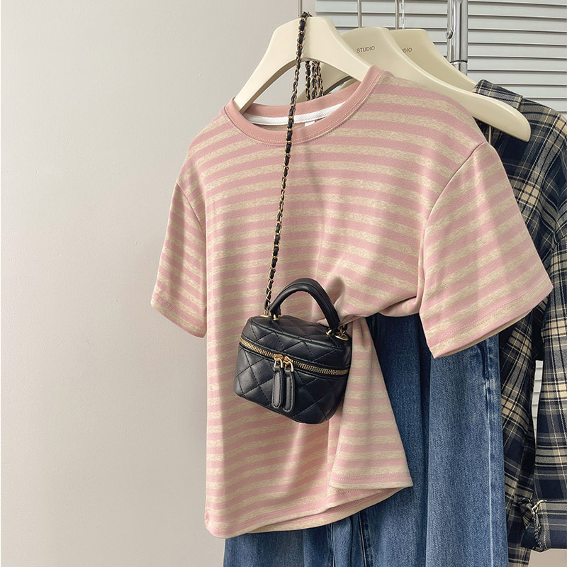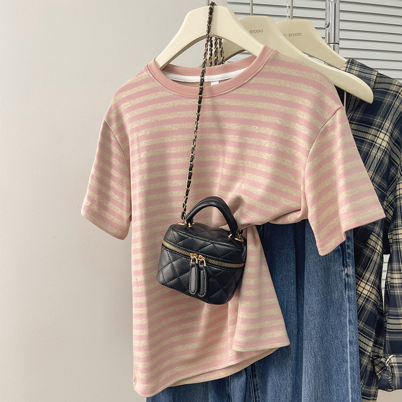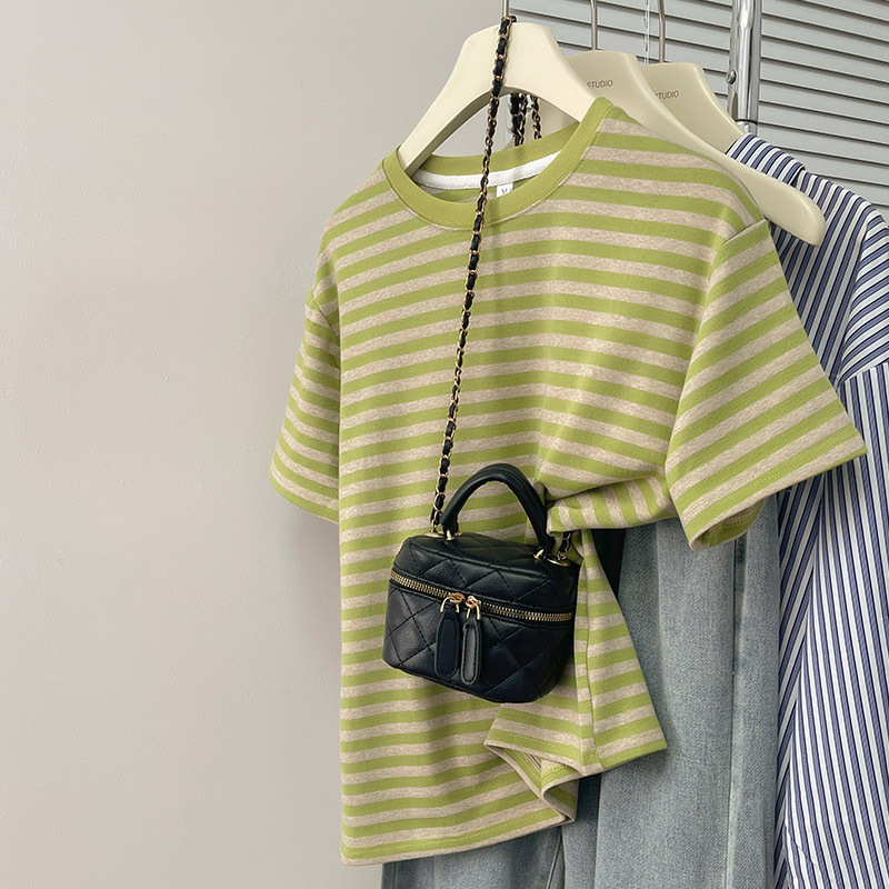 复古绿色条纹正肩短袖T恤女新款夏宽松显瘦休闲百搭体恤上衣