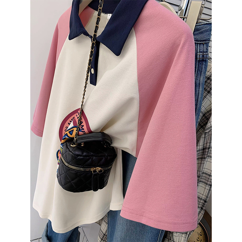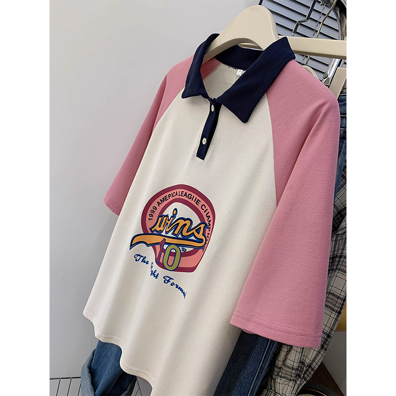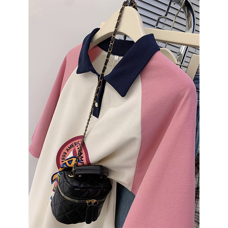 polo领撞色插肩短袖t恤女设计感中长款宽松显瘦休闲百搭上衣ins潮