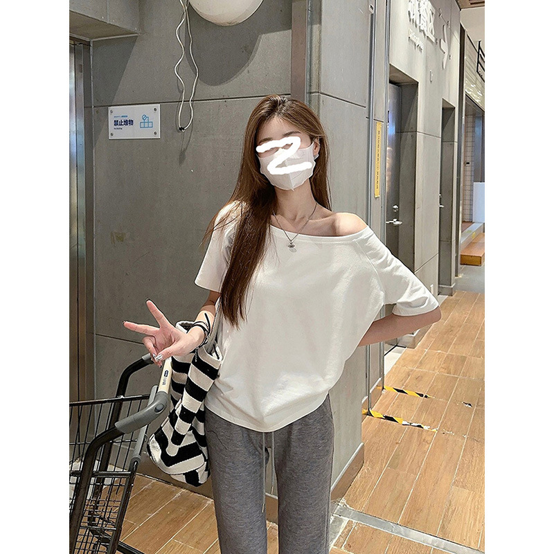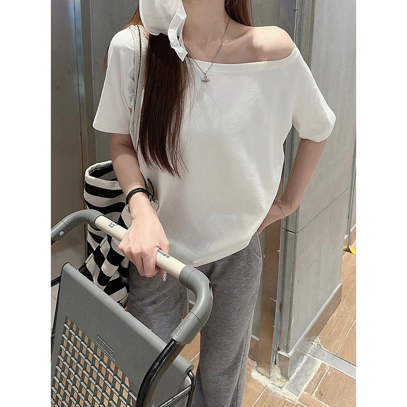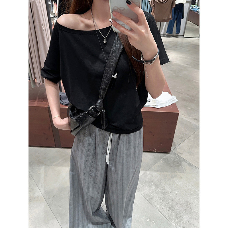 纯棉一字领短袖T恤女新款夏宽松设计感小众显瘦百搭薄款上衣