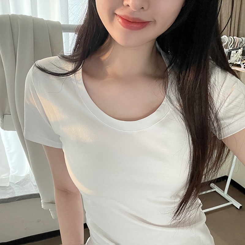 简约基础款小U领正肩短袖女t恤夏季辣妹修身短款内搭白色上衣服潮