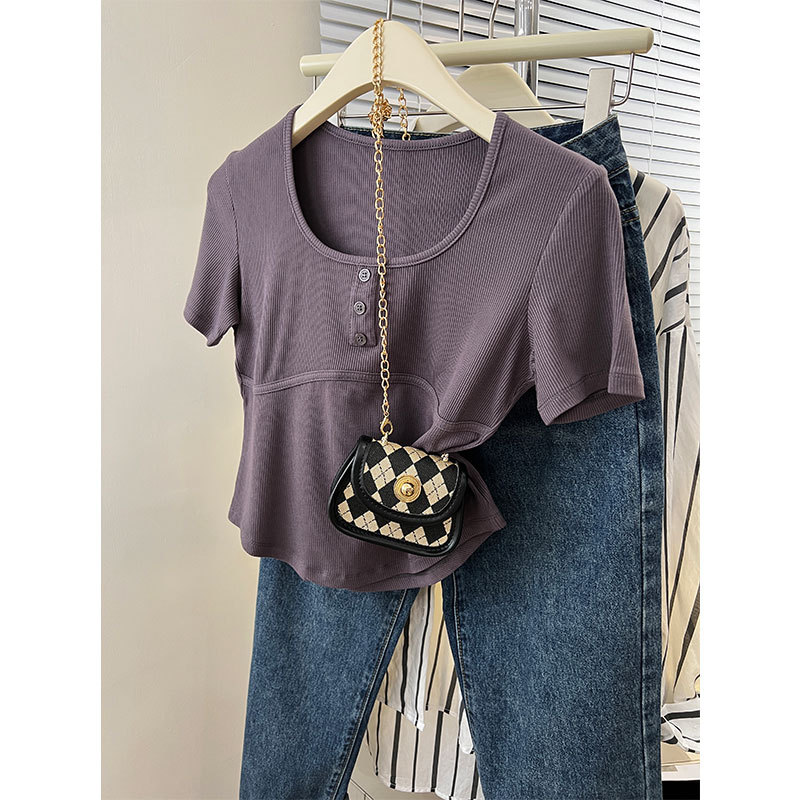 方领短袖t恤女螺纹上衣夏季新款设计感小众拼接体恤