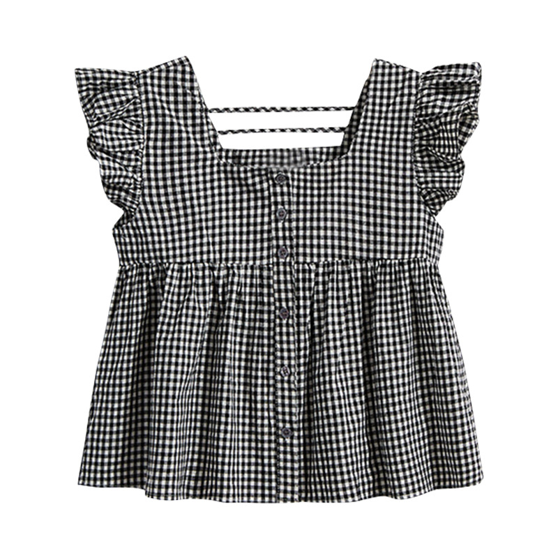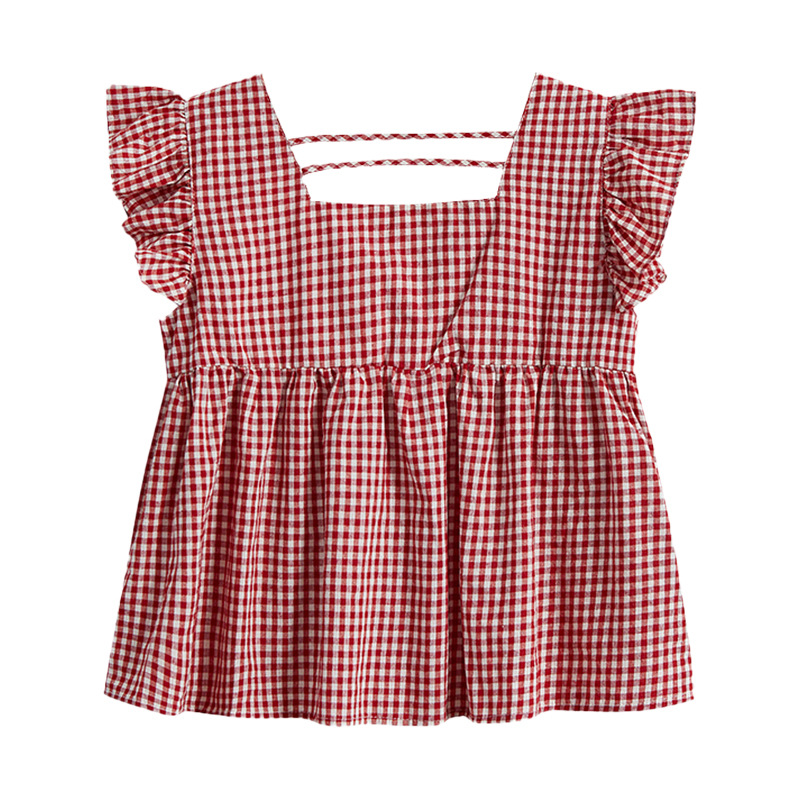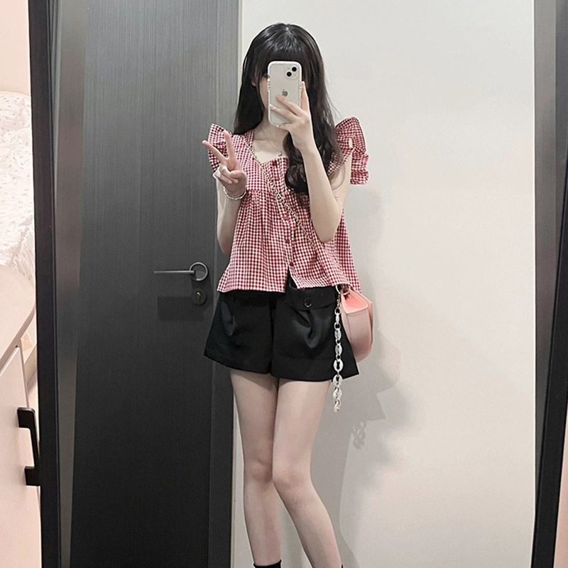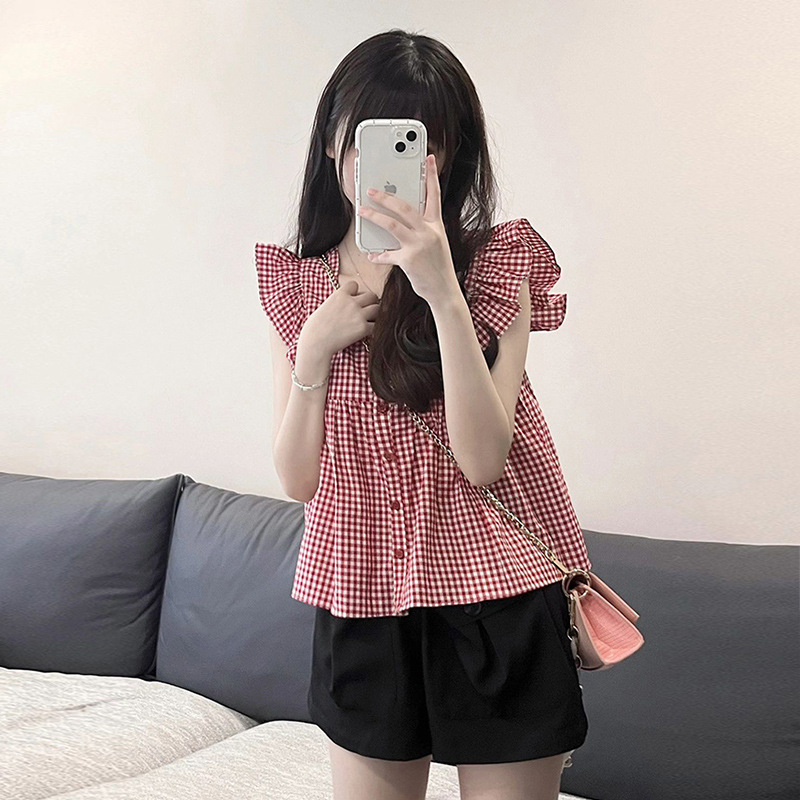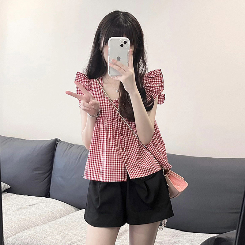 红色格子方领衬衫女设计感小众衬衣夏季新款宽松短款飞飞袖上衣潮