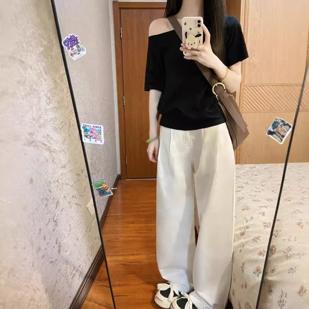 夏季新款明星同款一字领露肩宽松显瘦黑色短袖女胖mm遮肉纯欲