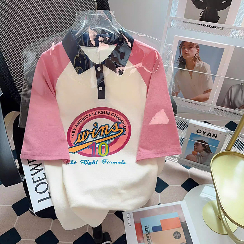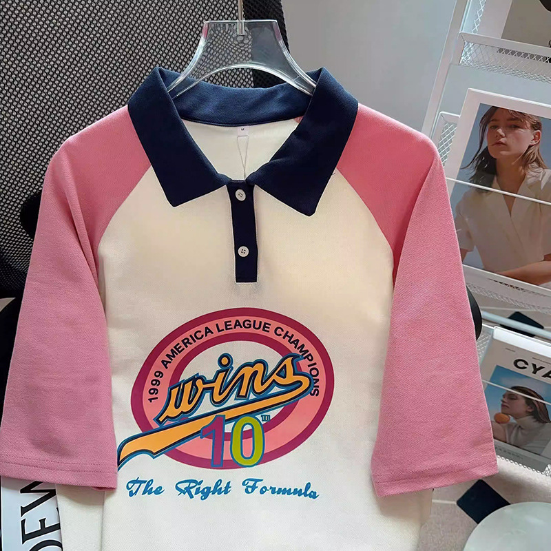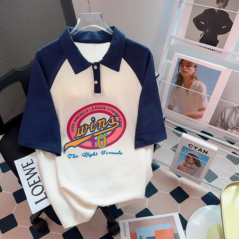 polo领短袖t恤女夏新款美式学院风宽松休闲减龄撞色正肩上衣