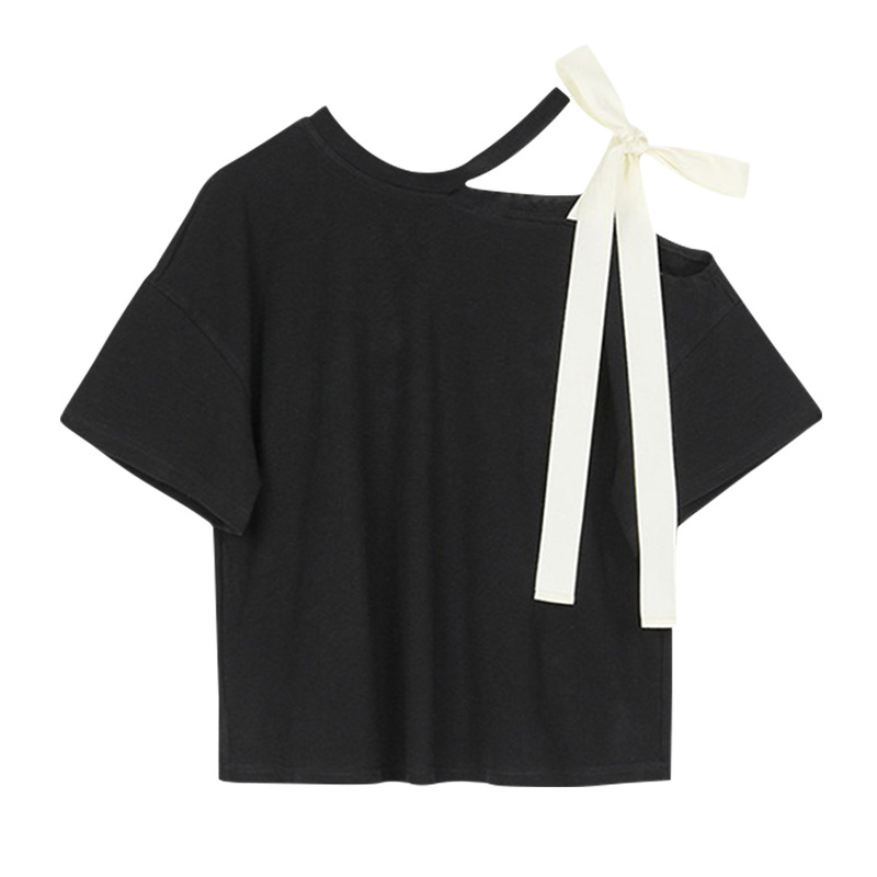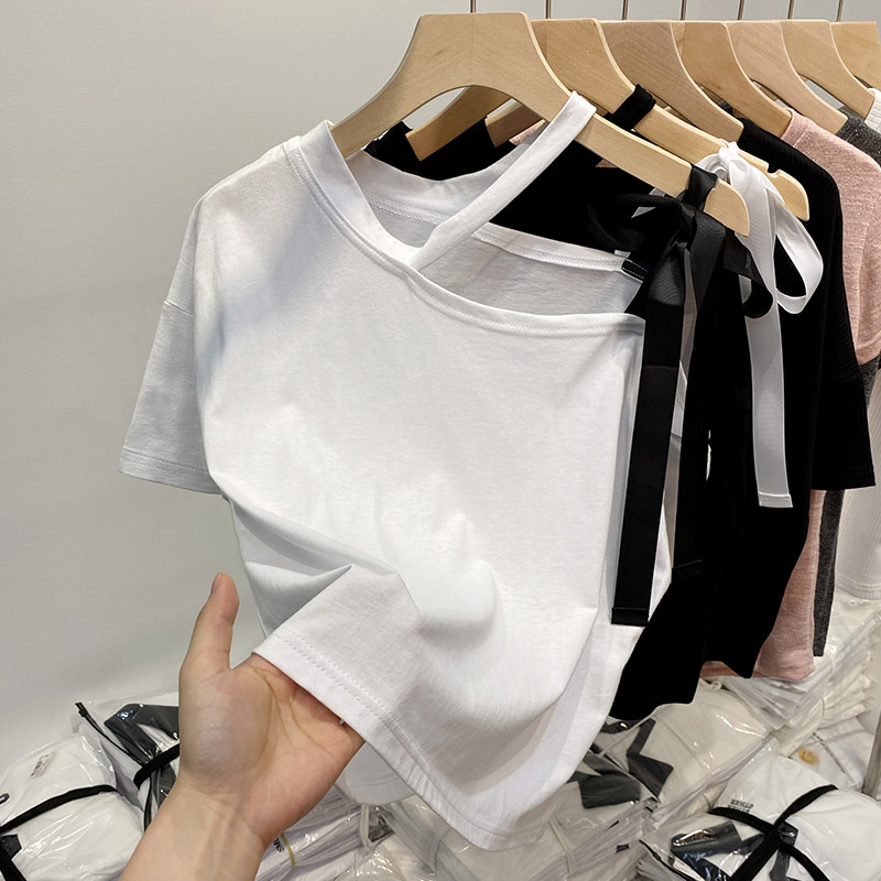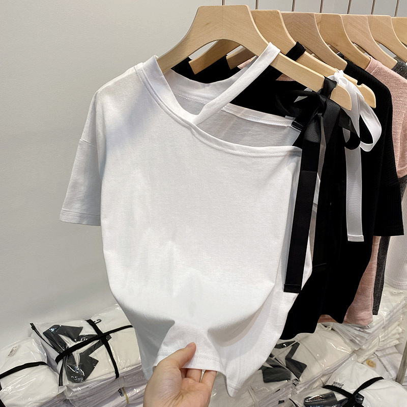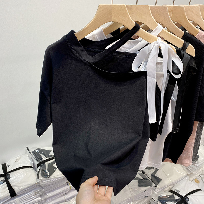 不规则露肩短袖t恤夏季微胖大码遮肚慵懒风上衣设计感宽松打底衫