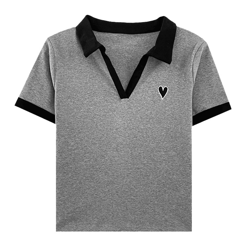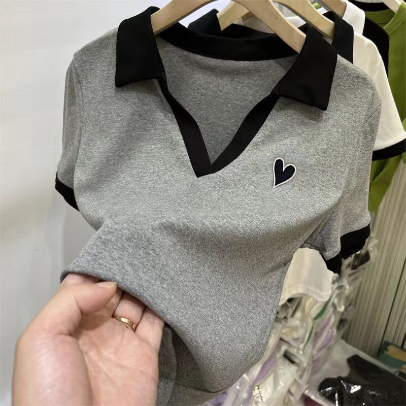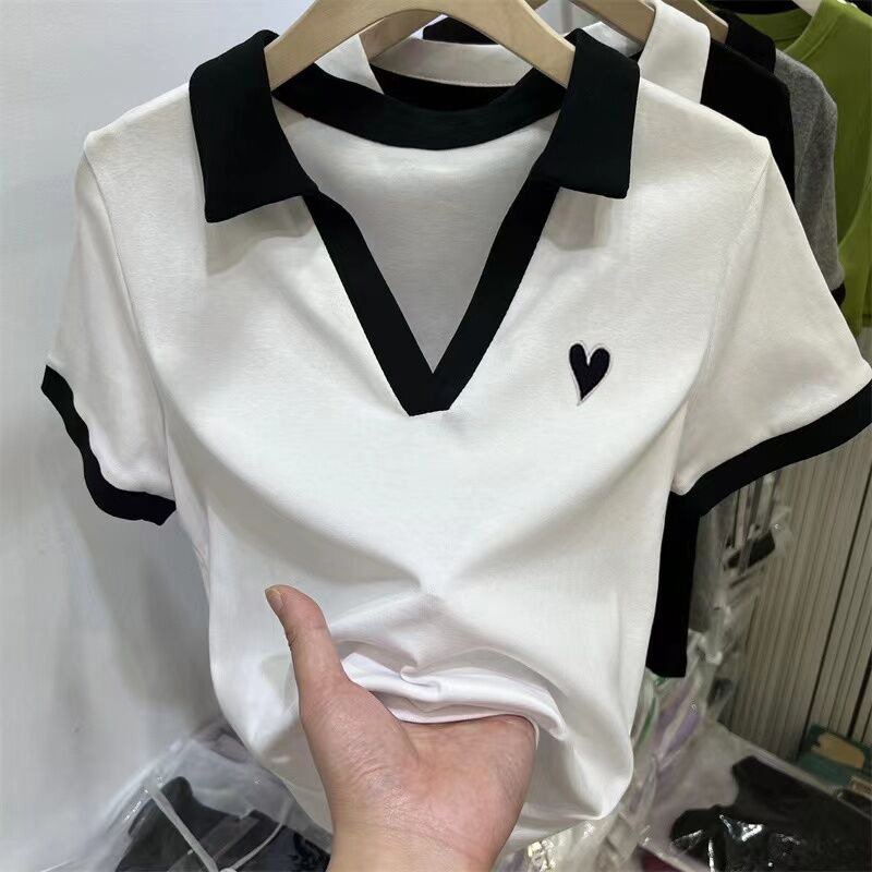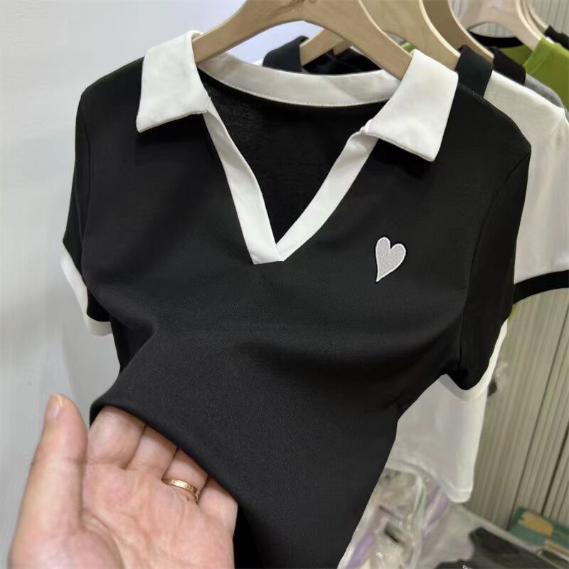 欧货v领短袖t恤女夏装新款修身辣妹美式复古短款polo衫上衣潮