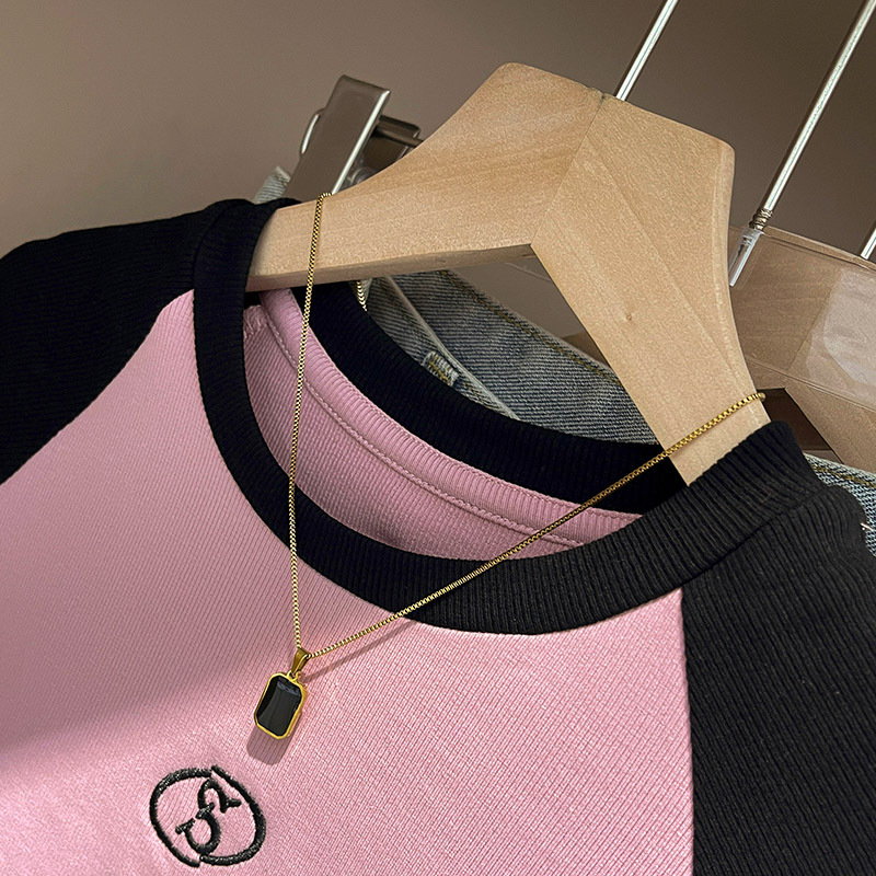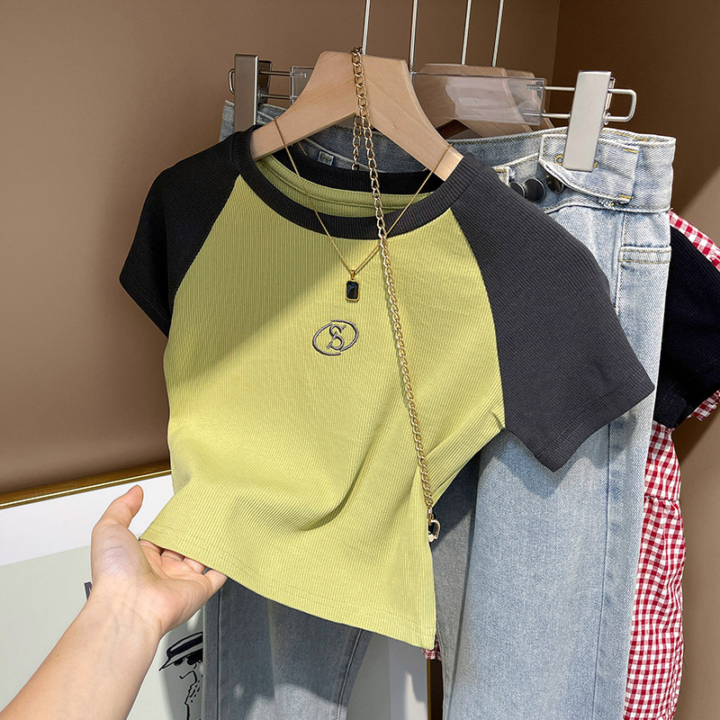 纯棉美式复古撞色插肩短袖t恤女夏短款辣妹正肩弹力修身显瘦上衣