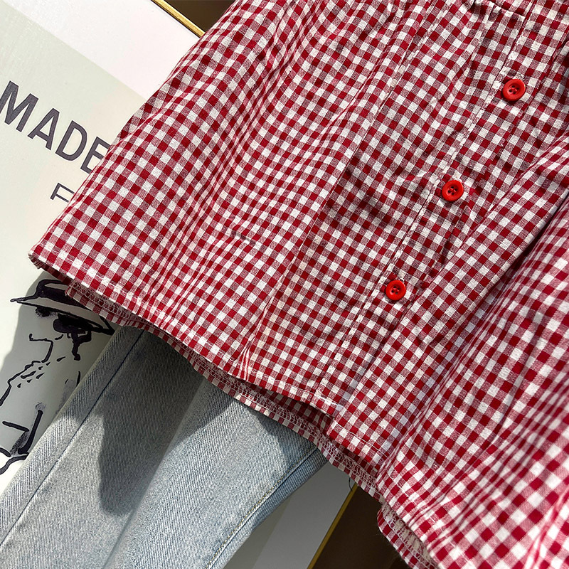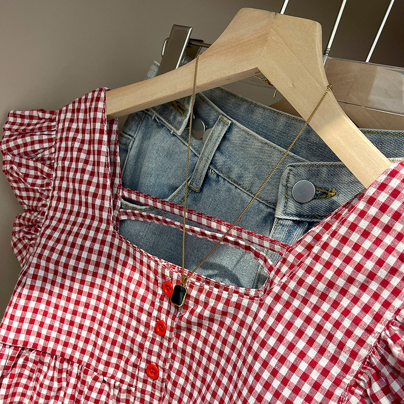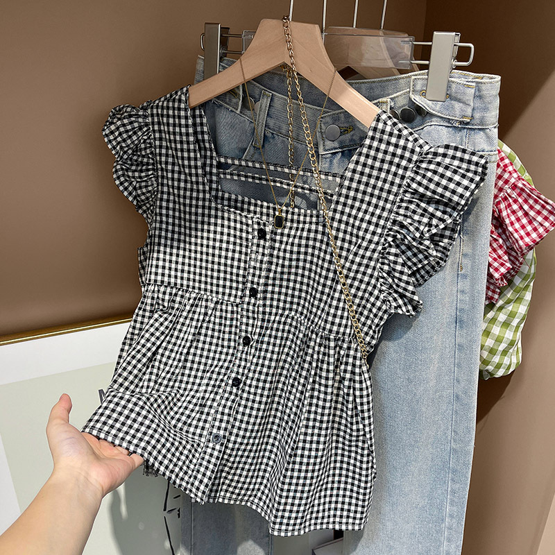纯棉方领格子衬衫女夏宽松显瘦设计感小个子小飞袖短款T恤女短袖