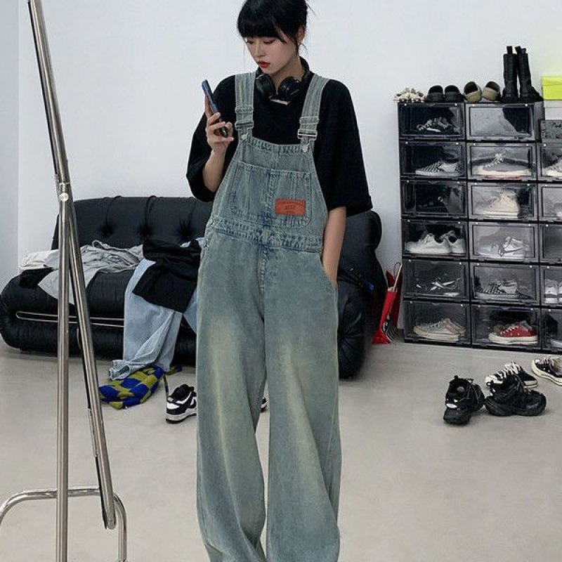 SIXI四喜家春夏 复古做旧感 宽松减龄牛仔背带裤女阔腿裤老爹长裤
