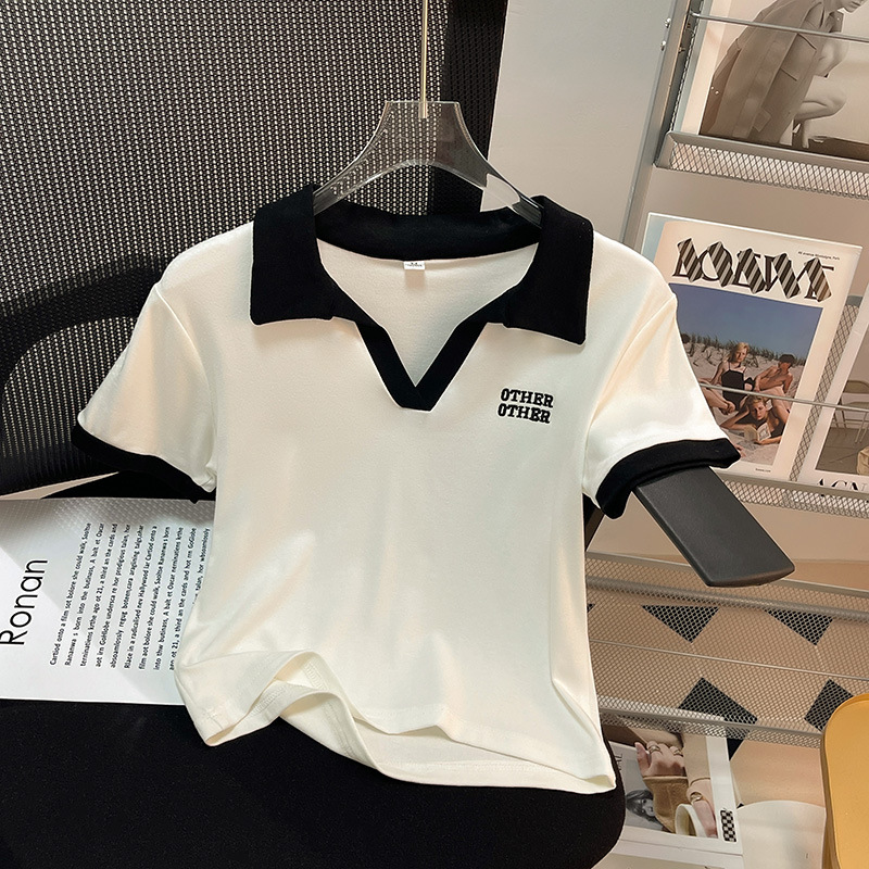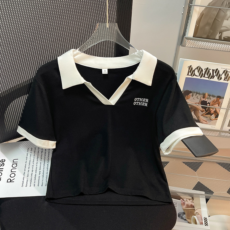 别致小V领撞色正肩短袖夏季新款辣妹港风polo领短款t恤女上衣体恤